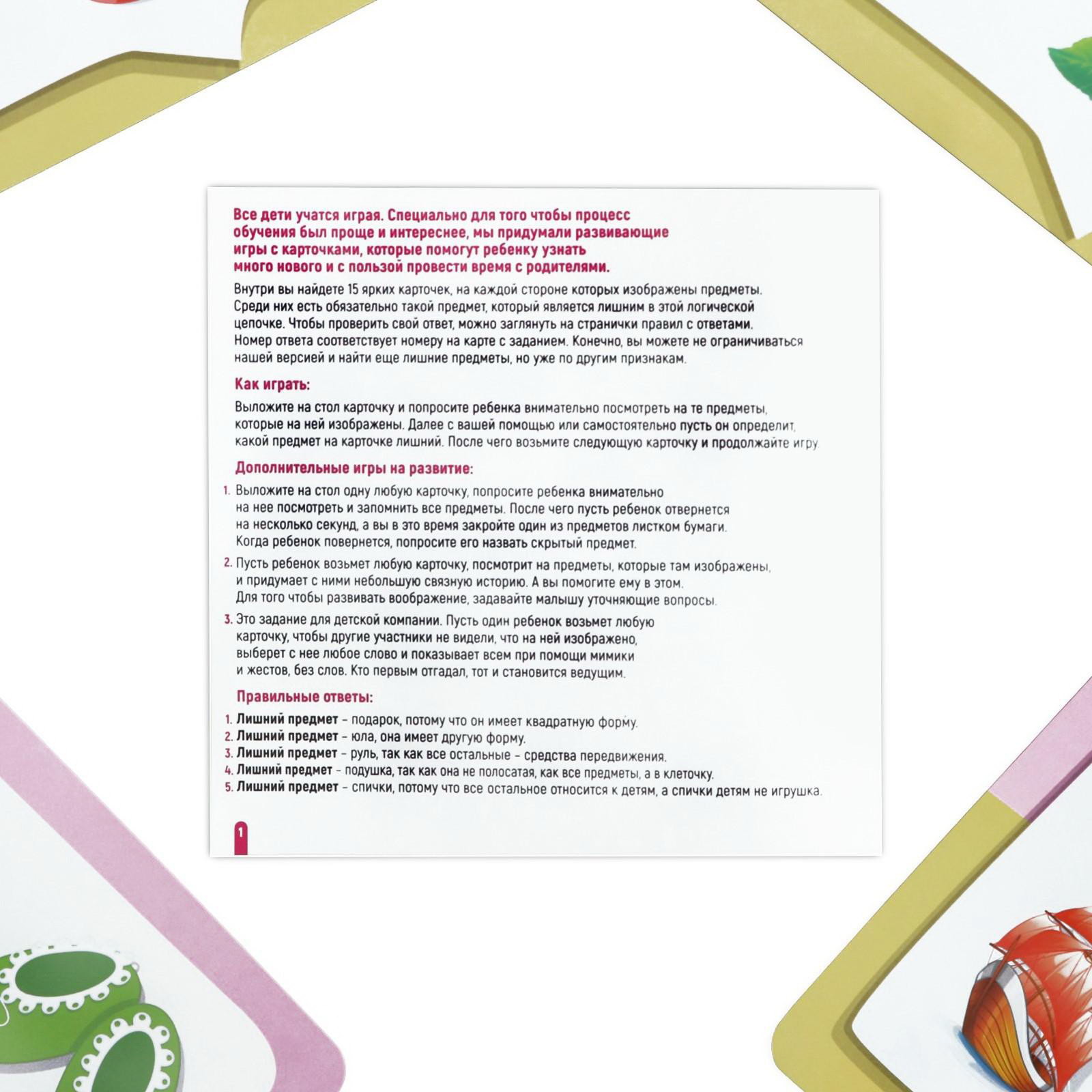 Развитие навыков: Внимание, Логика Жанр игры: Логическая, Развивающая Размер упаковки: 15 x 15 x 1 см. Время игры: 15 минут Тема обучения: Окружающий мир Возраст: От 3 лет Количество игроков: От 1 игрока Количество игроков: От 1 игрока tnved: 9504400000 Для кого: Унисекс Вид: Карточки с заданиями Медиагалерея: Видео Возрастная категория: 3+ Количество карточек: 30 Для маленьких умников Перед вами игра, благодаря которой малыш научится группировать предметы по общему признаку, логически мыслить и концентрировать внимание. Вытягивайте карточки и находите лишние изображения! Развиваемся играя На лицевой стороне карточек изображены предметы, среди которых обязательно есть лишний в этой логической цепочке. Он указан на обороте. Выложите на стол карточку и попросите ребёнка внимательно посмотреть на изображение. Далее с вашей помощью или самостоятельно малышу нужно определить, какой предмет на карточке лишний. Также в комплекте есть 3 дополнительных варианта игры, которые сделают процесс обучения еще более интересным и занимательным! Внутри вы найдёте: