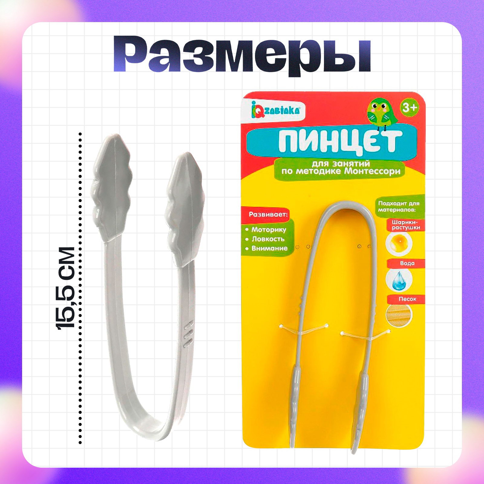 Пинцет для занятий по методике Монтессори, 3+, 4x15.5x2.5 см., IQ-ZABIAKA, Китай