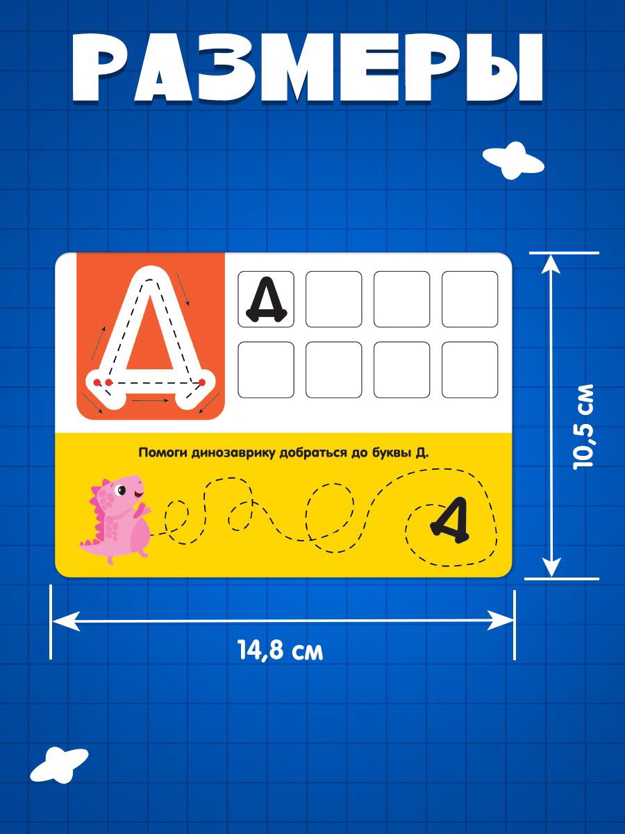 Развитие навыков: Буквы, цифры, Воображение, Моторика Тема обучения: Буквы, слова, русский язык, Творчество Размер упаковки: 11.5 x 2 x 18.5 см. Для кого: Унисекс tnved: 4911990000 Тематика набора: Роспись, раскраска, рисование Возраст: От 3 лет Вид: Настольно-печатные Набор научит ребёнка рисовать и выполнять логические упражнения. В процессе игры малыш познакомится с буквами русского языка, будет правильно их произносить и запомнит алфавит. На этих волшебных карточках можно писать маркером и стирать много раз благодаря специальному покрытию. Игра способствует развитию логики, моторики и внимания. В комплекте малыш найдёт маркер и 32 задания. Набор рекомендован детям старше 3 лет. Как играть?
