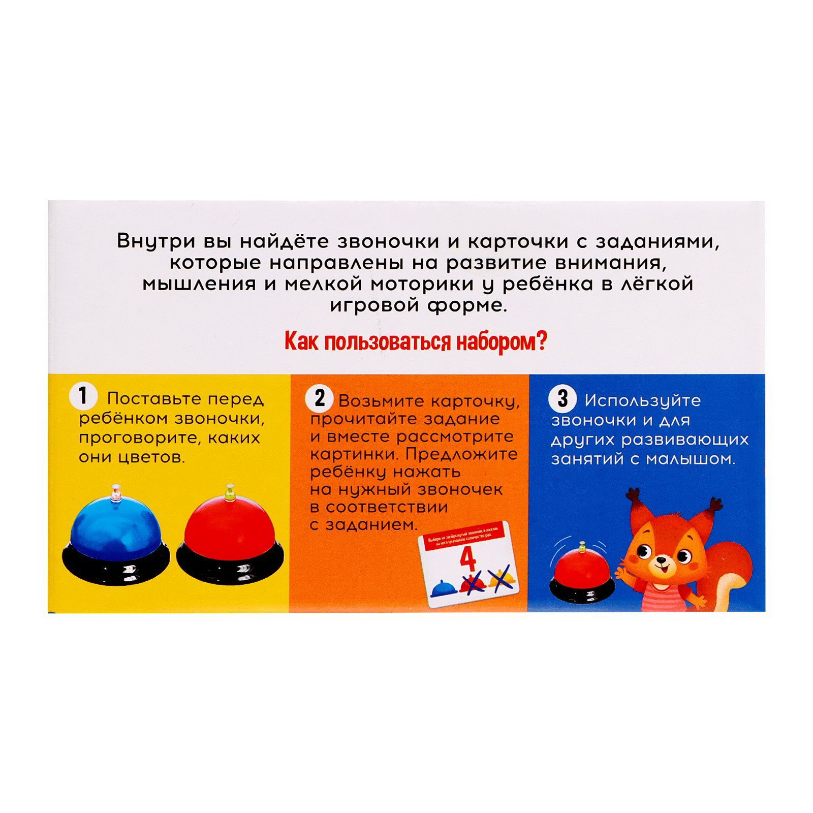 Развитие навыков: Кругозор, Логика, Моторика, Память, Реакция Жанр игры: Карточная, Развивающая Размер упаковки: 7 x 8.5 x 15 см. Игрушка с видео: Да Для кого: Унисекс tnved: 9503007000 Маркировка: Честный знак Количество игроков: 1 Возраст: От 3 лет Вид: Карточки с заданиями Развивающий набор станет любимой игрушкой ребёнка. В нём малыш обнаружит 2 цветных звонких колокольчика. Они помогут ему запомнить цвета, цифры, научиться считать и решать много полезных заданий с карточек. Как играть?