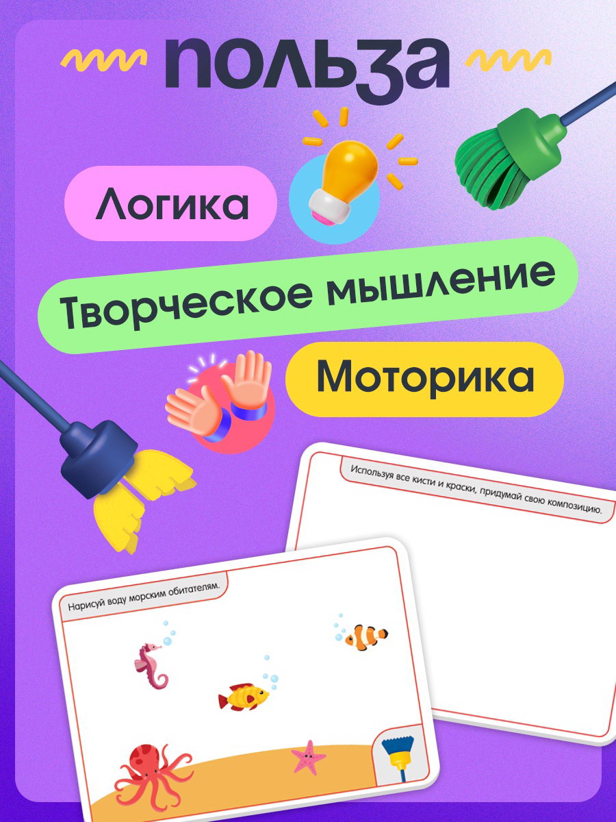 Тема обучения: Развитие логики/мышления, Творчество, Цвета, формы, звуки Вид: Карточки с заданиями, Настольно-печатные Развитие навыков: Внимание, Логика, Память Размер упаковки: 3 x 23.5 x 15 см. Для кого: Унисекс tnved: 9503007000 tnved: 9503007000 Тематика набора: Роспись, раскраска, рисование Возраст: От 3 лет С помощью набора малышу предстоит работать с фигурными кисточками, смешивать цвета, выполнять задания на карточках и просто весело фантазировать. Попросите малыша для каждого задания подобрать кисточку, которая оставит нужный след. Такое упражнение хорошо развивает логику и пространственное мышление. Как пользоваться набором?