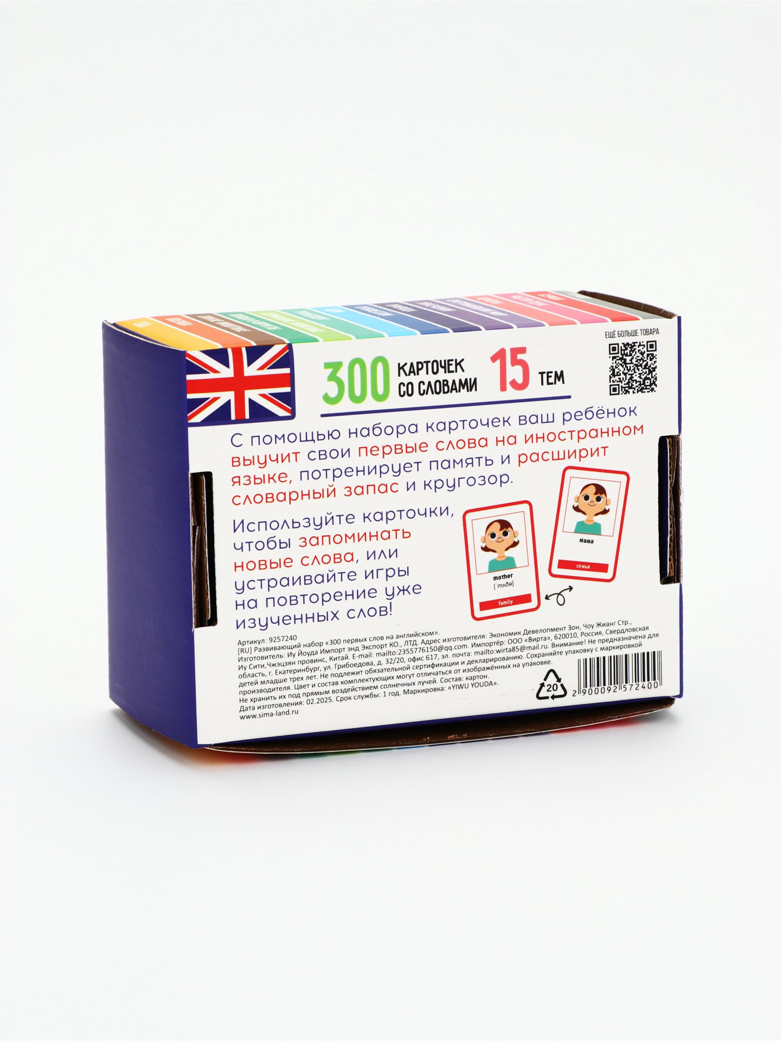 Развитие навыков: Буквы, цифры, Внимание, Грамматика, Кругозор, Логика, Память, Чтение Вид: Логопедические наборы, Настольно-печатные Размер упаковки: 14 x 10.5 x 7 см. Для кого: Унисекс tnved: 4911990000 Возраст: От 5 лет Развивающий набор "300 слов" на английском языке поможет малышу выучить свои первые слова на иностранном языке, потренировать память, расширить словарный запас и кругозор. Внутри вы найдёте обучающие карточки, 15 тем и 300 слов с транскрипцией и переводом. Как заниматься