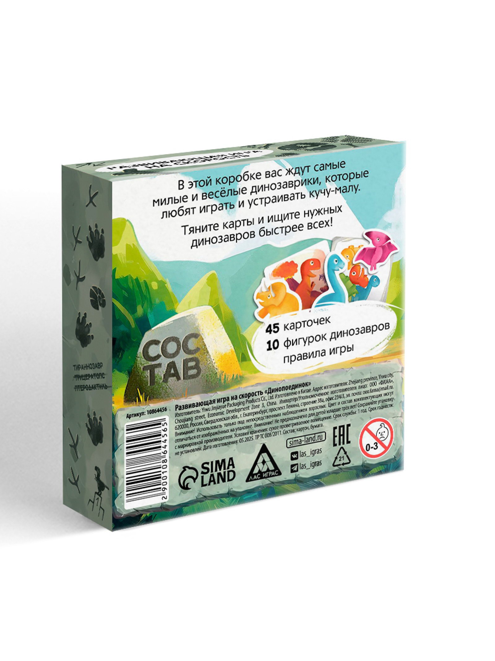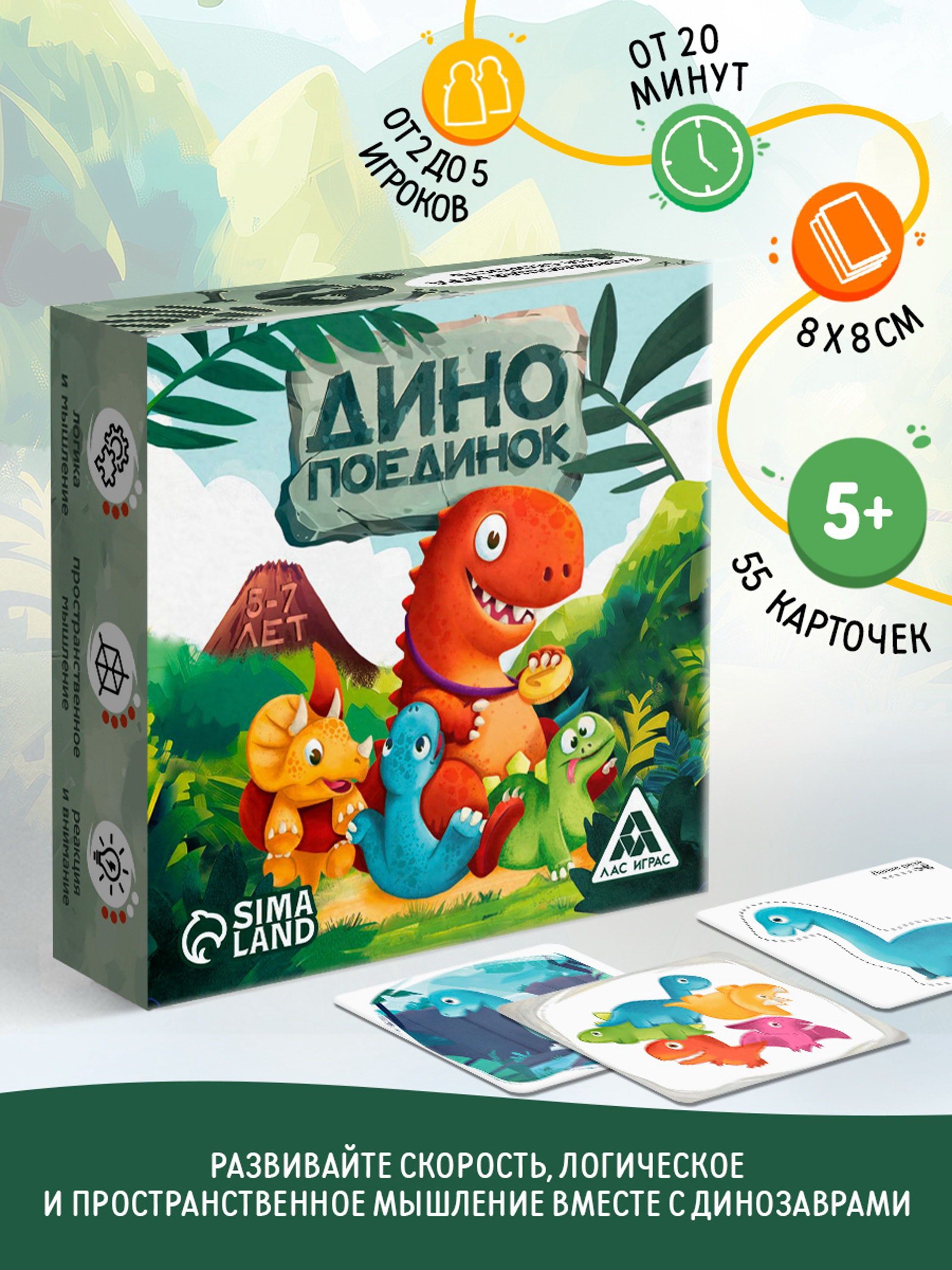 Настольная игра на скорость "Динопоединок", развивающая, 55 карт, 5+, 2x9.5x12 см., ЛАС ИГРАС, Китай