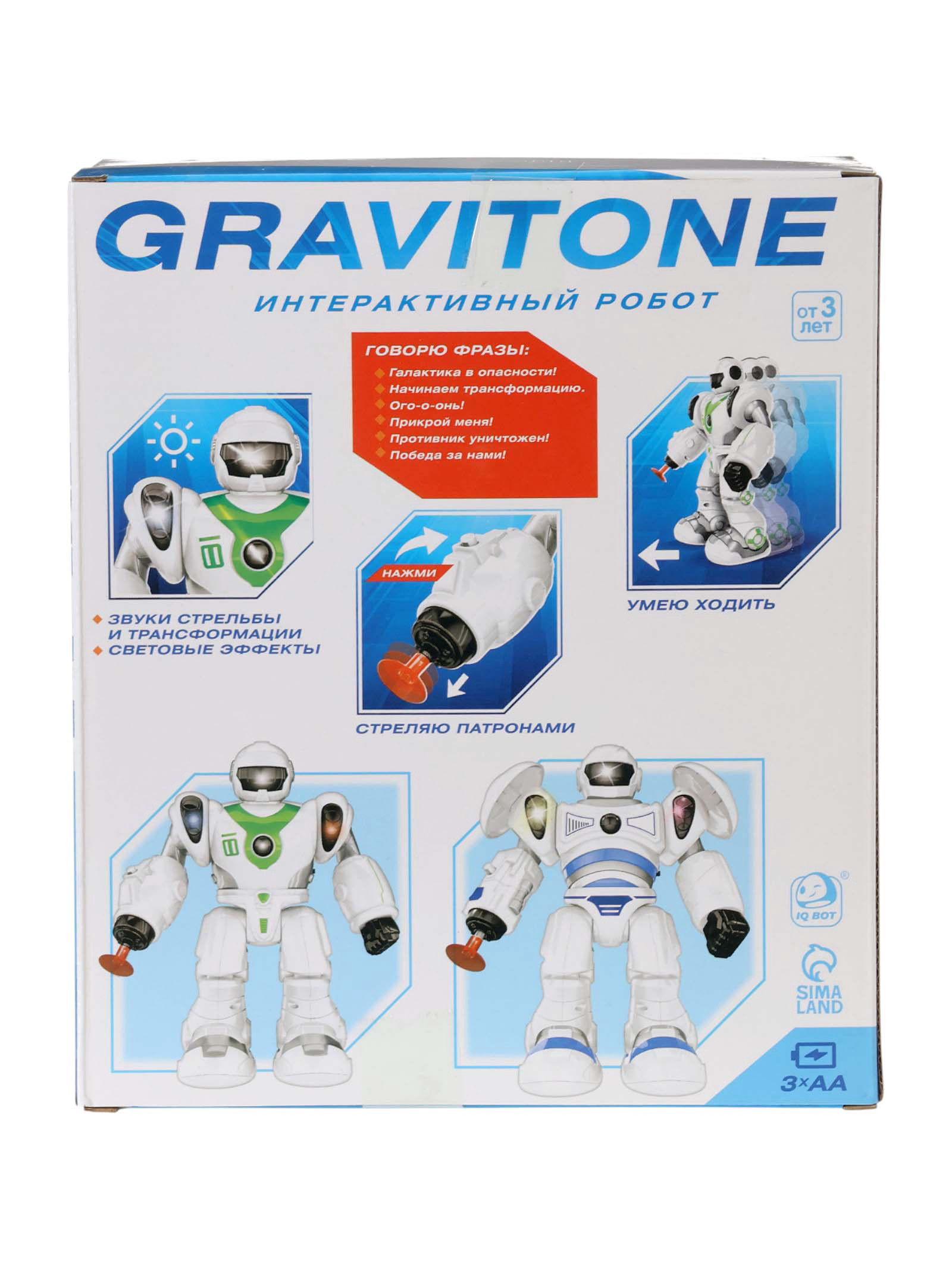 Дополнительные функции: Звуковые эффекты, Светящаяся Размер упаковки: 10.5 x 21.5 x 18 см. Игрушка с видео: Да Для кого: Для мальчика tnved: 9503008000 tnved: 9503008000 Форма: Классический робот Тип механизма: Самоходный Тип питания: От батареек Вид упаковки: Коробка картонная с PVC Типоразмер батареек: AA (LR6) Возраст: От 3 лет Русская упаковка: Да Русская озвучка: Да Робототехника: Нет Батарейки в комплекте: Нет Количество батареек: 3 Робот GRAVITONE станет верным спутником ребёнка. С ним малыш воплотит сюжеты, связанные с исследованием глубин космоса или спасением мира от инопланетных захватчиков! Игрушка умеет ходить, говорить на русском языке и стрелять мягкими патронами. Особенности работа "Гравитон"