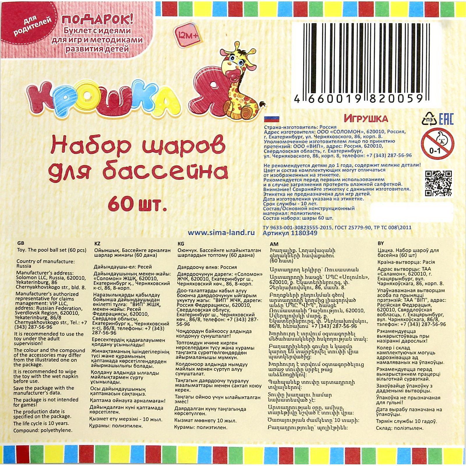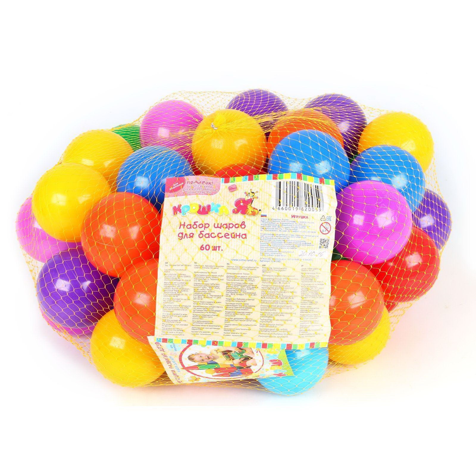 Размер упаковки: 40 x 25 x 40 см. В наборе, шт.: 60 В наборе, шт.: 60 tnved: 9503007000 Возраст: От 1 года Цвет: Разноцветный Яркие разноцветные шарики для сухого бассейна добавят в детские игры больше позитива, веселья и азарта! На каждом элементе прорисована картинка: машинка, жирафик, солнышко, цветочек, сердечко, кораблик, улыбка или звёздочка. Шарики выполнены в сочных глянцевых красках, они отлично развивают у малышей восприятие цвета. Кругляшками можно наполнить детскую палатку с дном или бассейн. В них ребёнок будет "купаться", валяться, а также подбрасывать лёгкие шарики вверх и учиться их ловить. В игре у юных непосед развиваются такие полезные навыки, как координация движений, меткость, ловкость и умение взаимодействовать с другими детьми. Полная безопасность Товар разработан и произведён в России из российских материалов и соответствует всем ГОСТам, имеет множество преимуществ. Особенности: