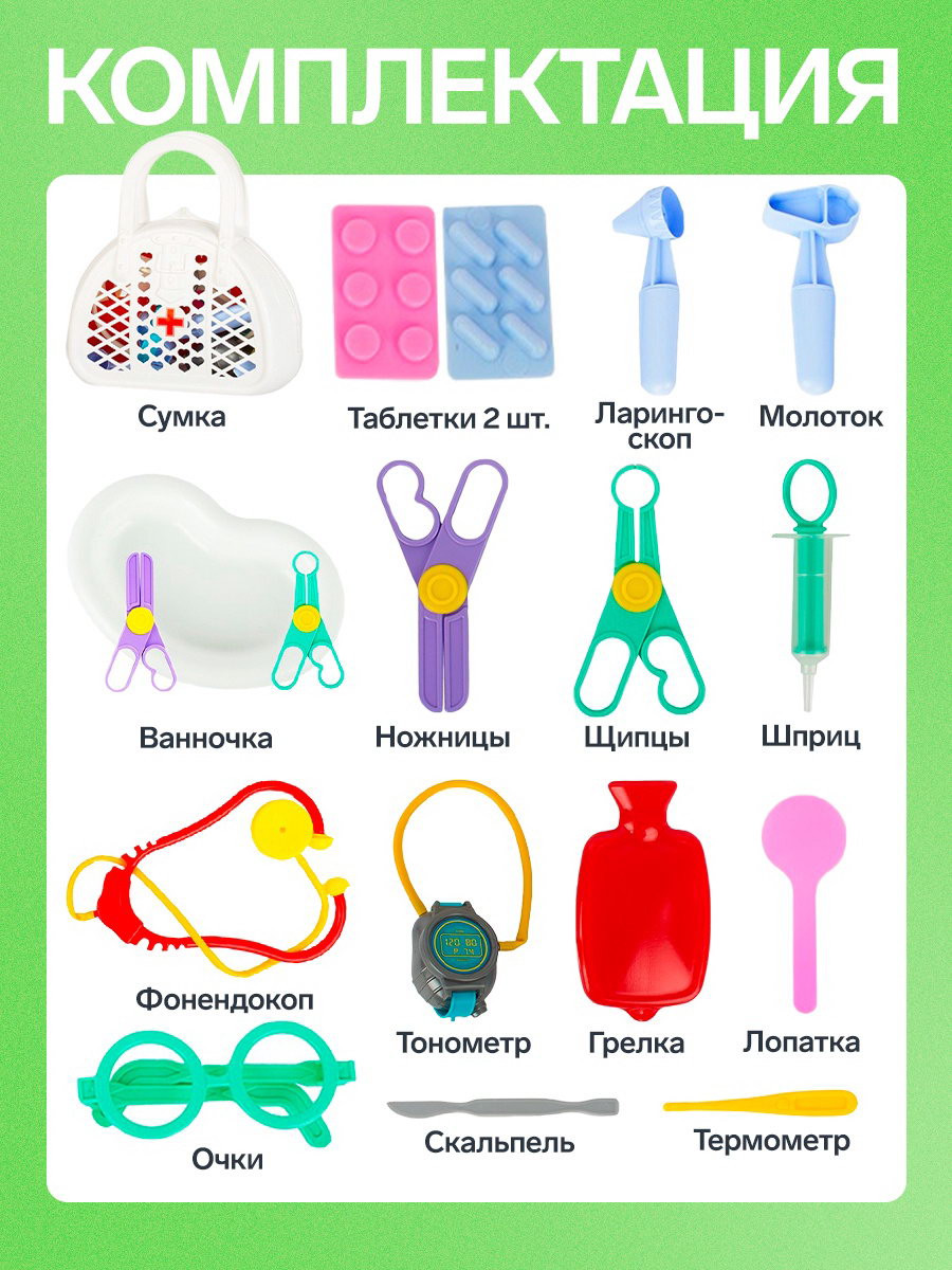 Вид: Набор, Терапевт Размер упаковки: 24 x 9.5 x 22 см. Вид упаковки: Сетка tnved: 9503007000 tnved: 9503007000 Возраст: От 3 лет Тематика: Профессии Для кого: Унисекс Игровой набор "Доктор № 3" это полный набор аксессуаров для создания увлекательной ролевой игры во врача. В набор входят 16 предметов, упакованных в удобную сумку. Играя с этим набором, ребёнок развивает свою моторику и координацию движений, а также осваивает базовые социальные и бытовые навыки. Во время игры малыш может проявить свою фантазию и воображение, создавая разные ситуации и роли. Набор способствует развитию ролевой игры и помогает детям лучше понять мир взрослых. Все предметы набора выполнены из высококачественных материалов, которые безопасны для детей. Набор прошел проверку на соответствие требованиям технических регламентов Таможенного союза и имеет сертификацию ЕАС. | ||