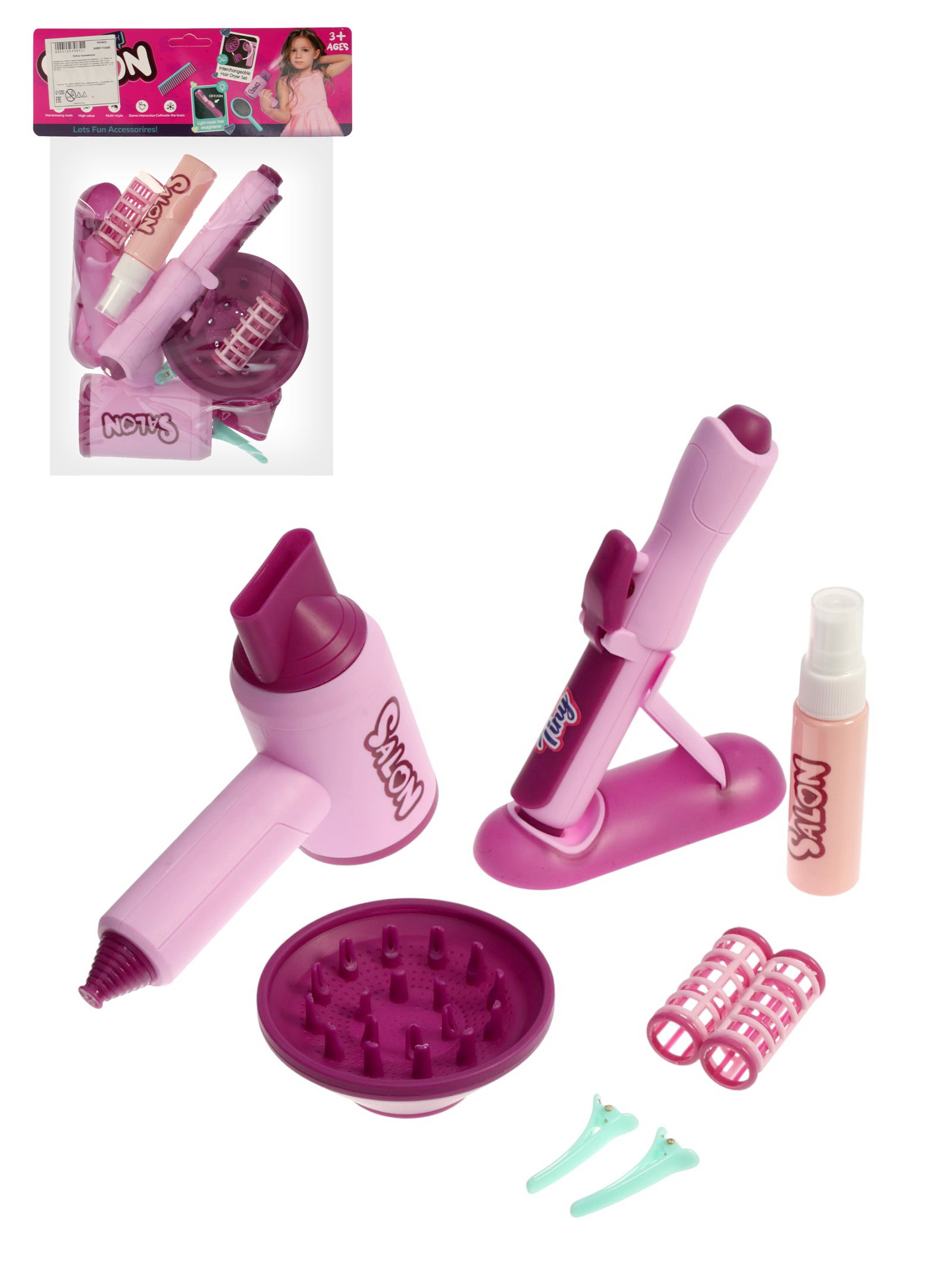 Размер упаковки: 20 x 7 x 22 см. tnved: 9503007000 Тематика: Профессии Возраст: От 3 лет Типоразмер батареек: AAA (LR03) Для кого: Для девочки Вид: Набор парикмахера Набор парикмахера "Салон красоты" это яркая игровая коллекция для маленьких стилистов, которым нравится создавать причёски и повторять действия взрослых. В комплект входят аксессуары, выглядящие как настоящие инструменты: фен, плойка со световым эффектом, распылитель, бигуди, диффузор и зажимы для волос. Детали лёгкие, удобно лежат в руках и подходят для сюжетных игр дома, в гостях или на детском празднике. Плойка светится при включении, добавляя игре эффект присутствия "как в салоне", а фен и распылитель делают процесс создания причёсок ещё интереснее. Набор помогает развивать фантазию, аккуратность, творческое мышление и навыки ролевой игры. Особенности