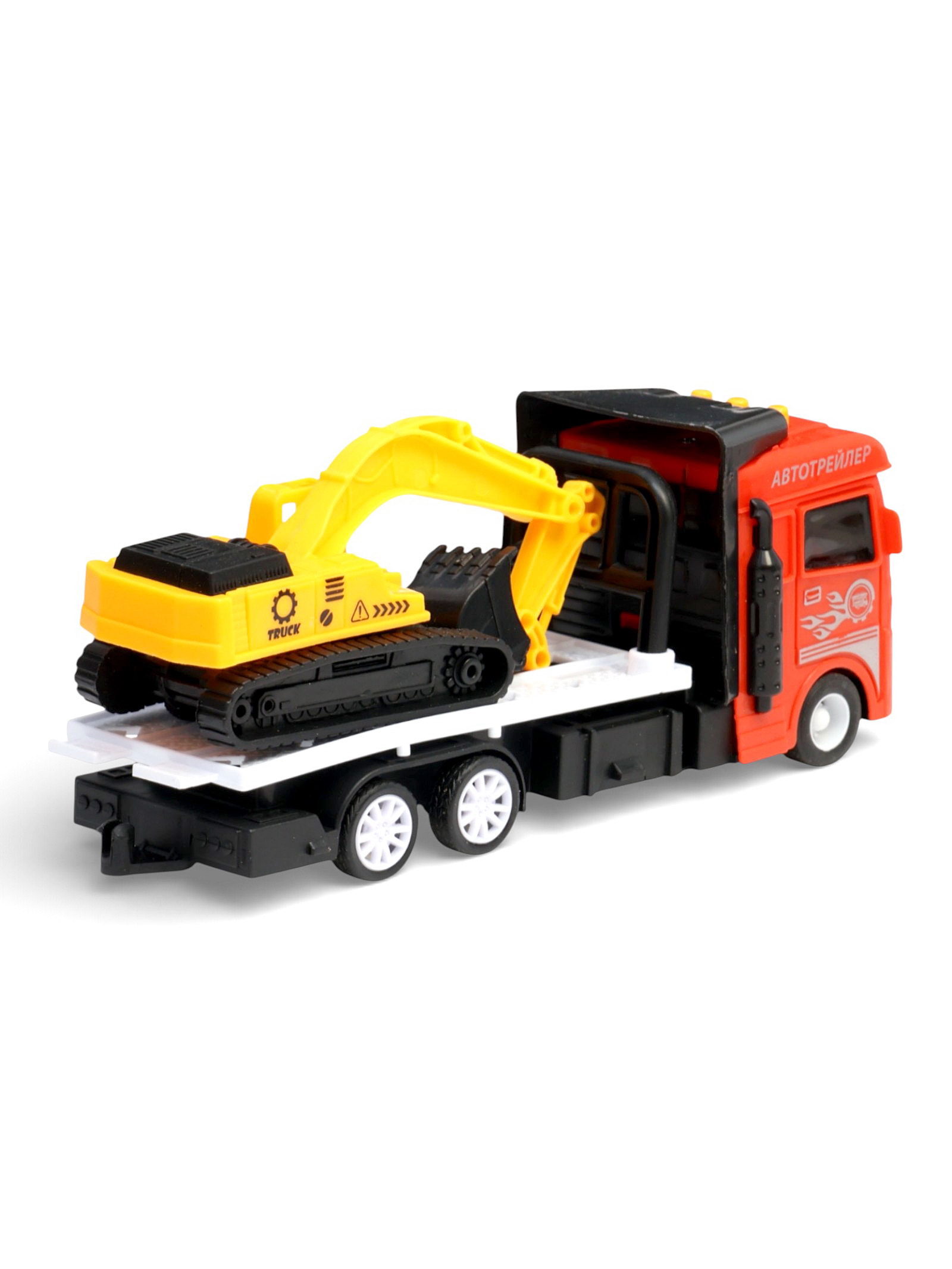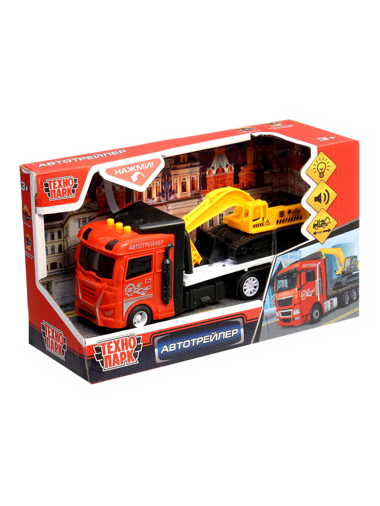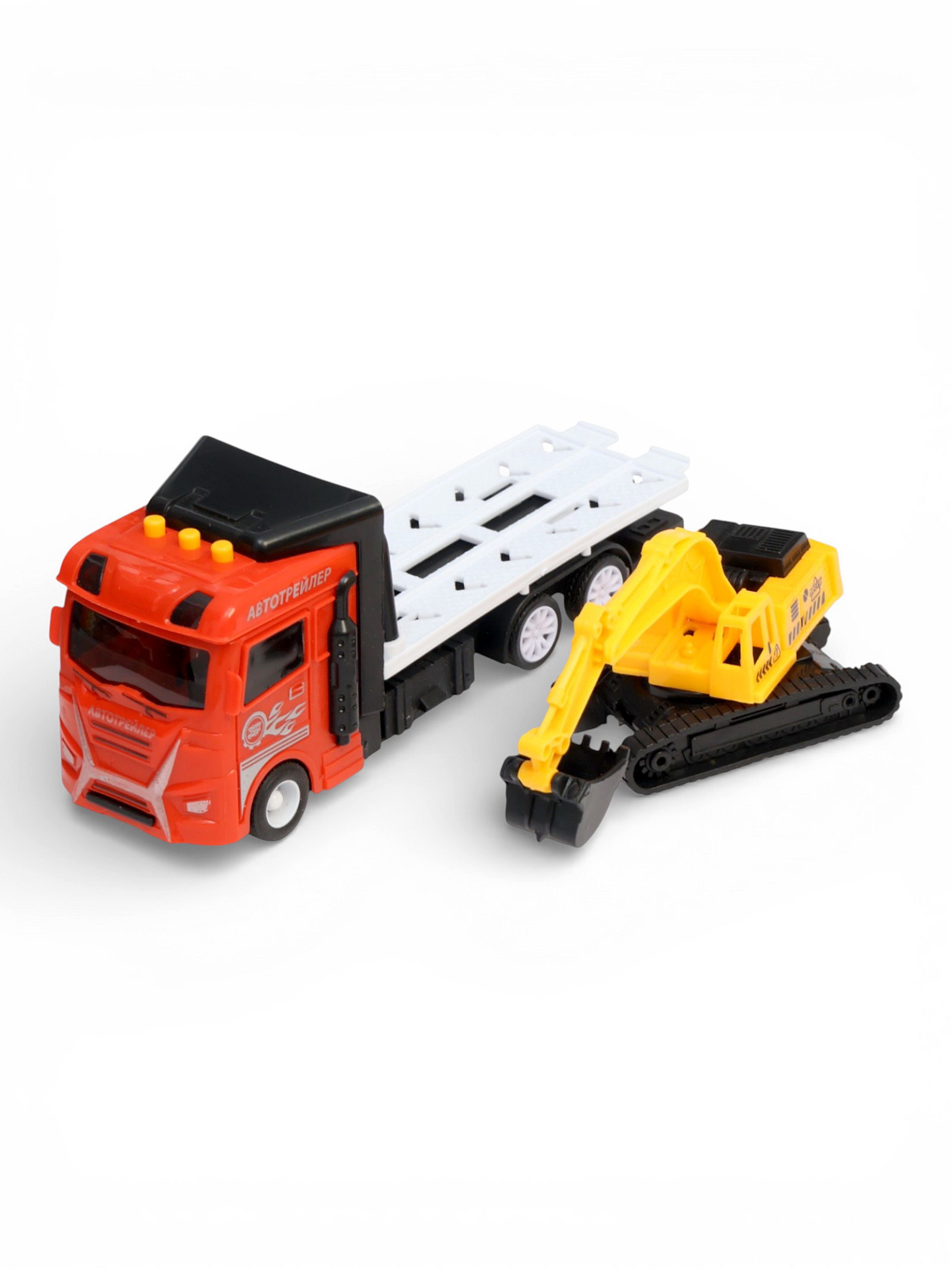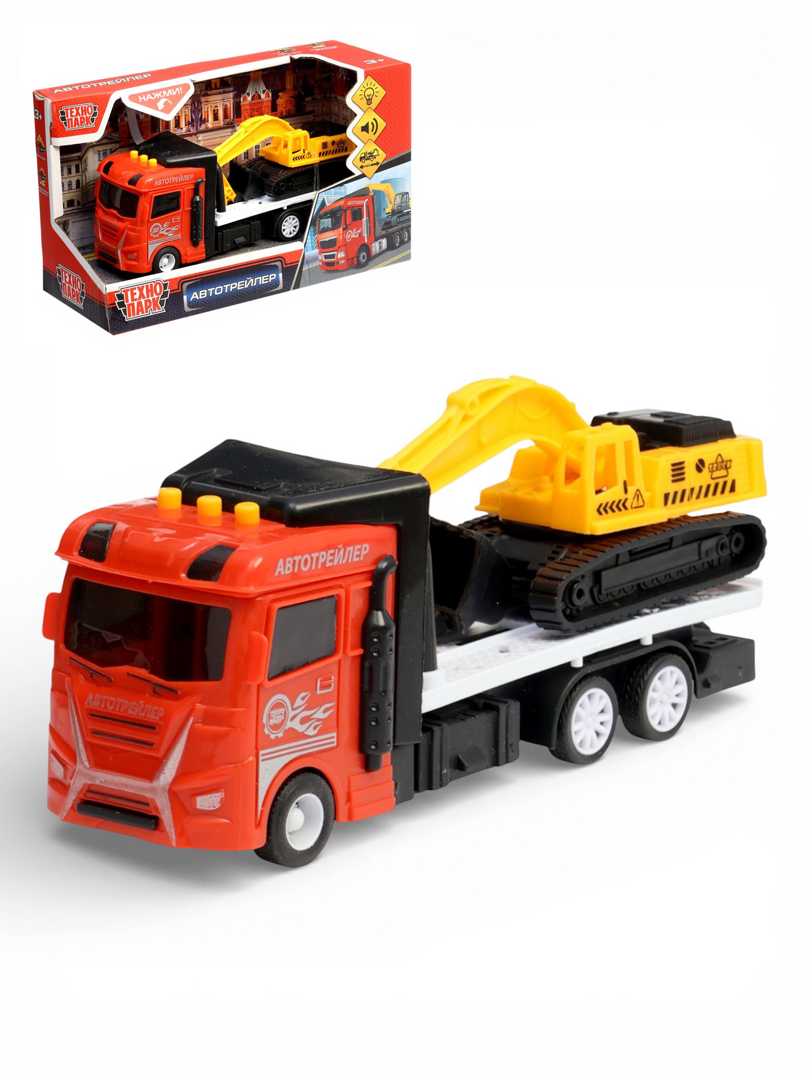 Машина пластиковая "Автоперевозчик", 20 см, свет и звук, инерция, подвижные детали, экскаватор в комплекте, Технопарк, Китай