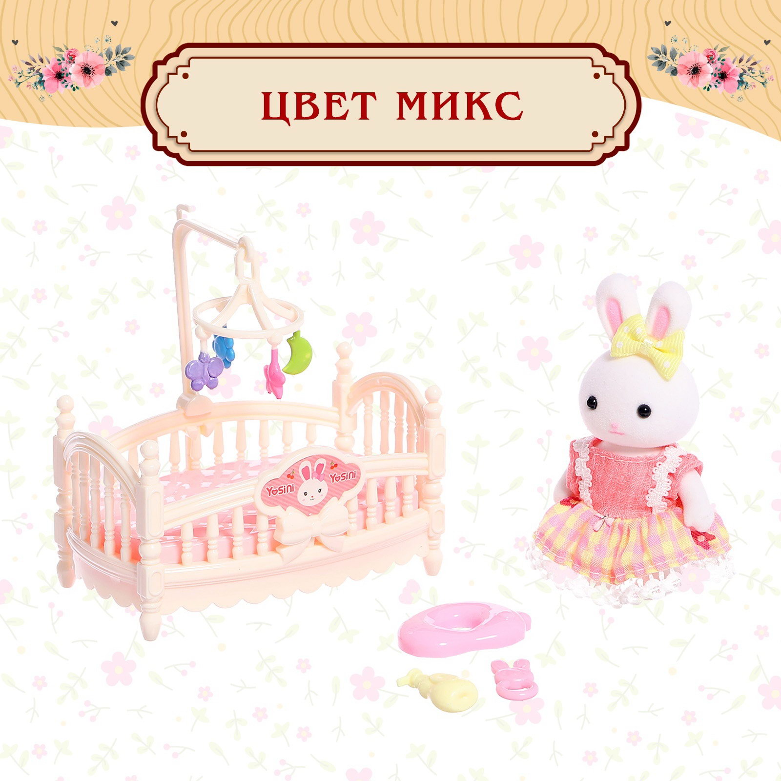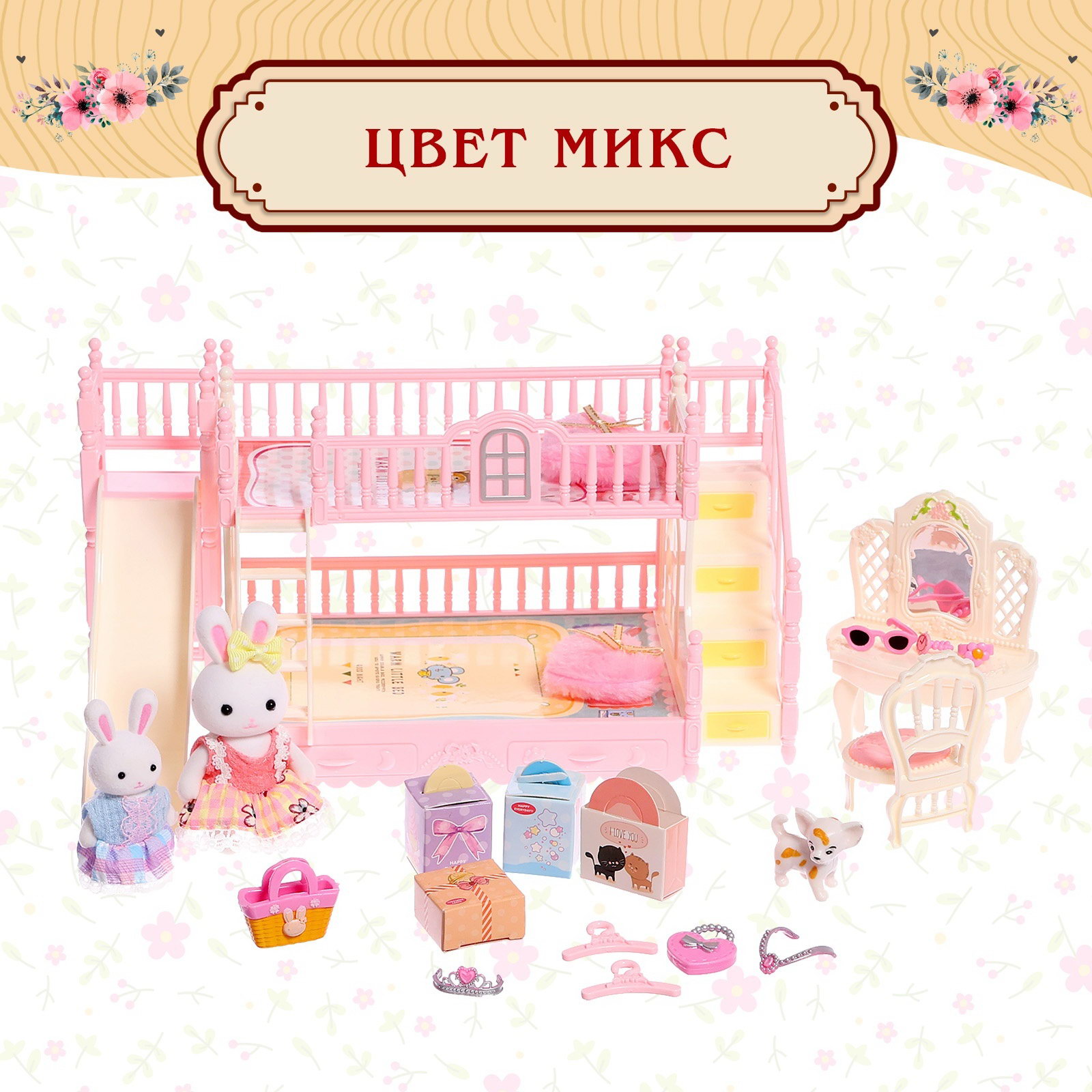 Вид: Кроватки, Питомцы, Стул, Туалетный столик Размер упаковки: 17.5 x 20.5 x 40 см. Для кого: Для девочки tnved: 9503007000 tnved: 9503007000 Возраст: От 3 лет Дополнительные функции: Сюжетно-ролевая Вид упаковки: PVC-коробка Подходит по размеру для кукольного домика: Да Цвет: Розовый Игровой набор с мебелью и аксессуарами создан для сюжетно-ролевых игр, где главные герои очаровательные зайчики. Девочки от 3 лет смогут придумывать истории, обустраивать домик и развивать воображение через игру. Особенности