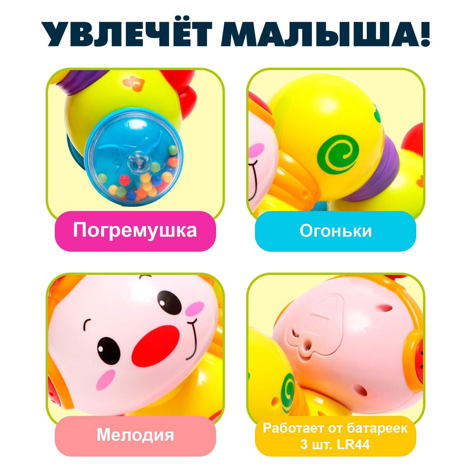Дополнительные функции: Звуковые эффекты, Развивающая, Светящаяся Вид: Гусеница, червь, Игрушка-каталка, Насекомые Размер упаковки: 15 x 13 x 25.5 см. Типоразмер батареек: LR44 (V13GA, AG13, LR1154, SR44) Количество батареек: 3 Для кого: Унисекс Форма: Гусеница Вид каталки: Ручные Особенности: Без верёвки/палки Возраст: От 6 месяцев Возраст: От 6 месяцев tnved: 9503006000 Тип механизма: Самоходный Тип питания: От батареек Музыкальная игрушка-каталка "Гусеница" станет отличным выбором для развлечения и развития детей с 6 месяцев. Она сочетает в себе весёлую каталку, яркие световые эффекты и приятные мелодии, которые увлекут ребёнка и подарят радость. Особенности
