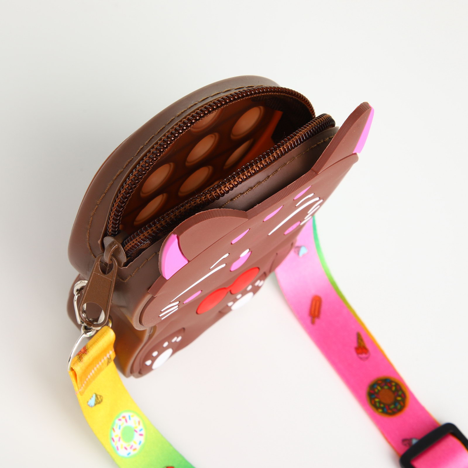 Сумка для девочки "Кошечка", поп ит, силиконовая, на молнии, коричневая, 3x9x12 см., Китай