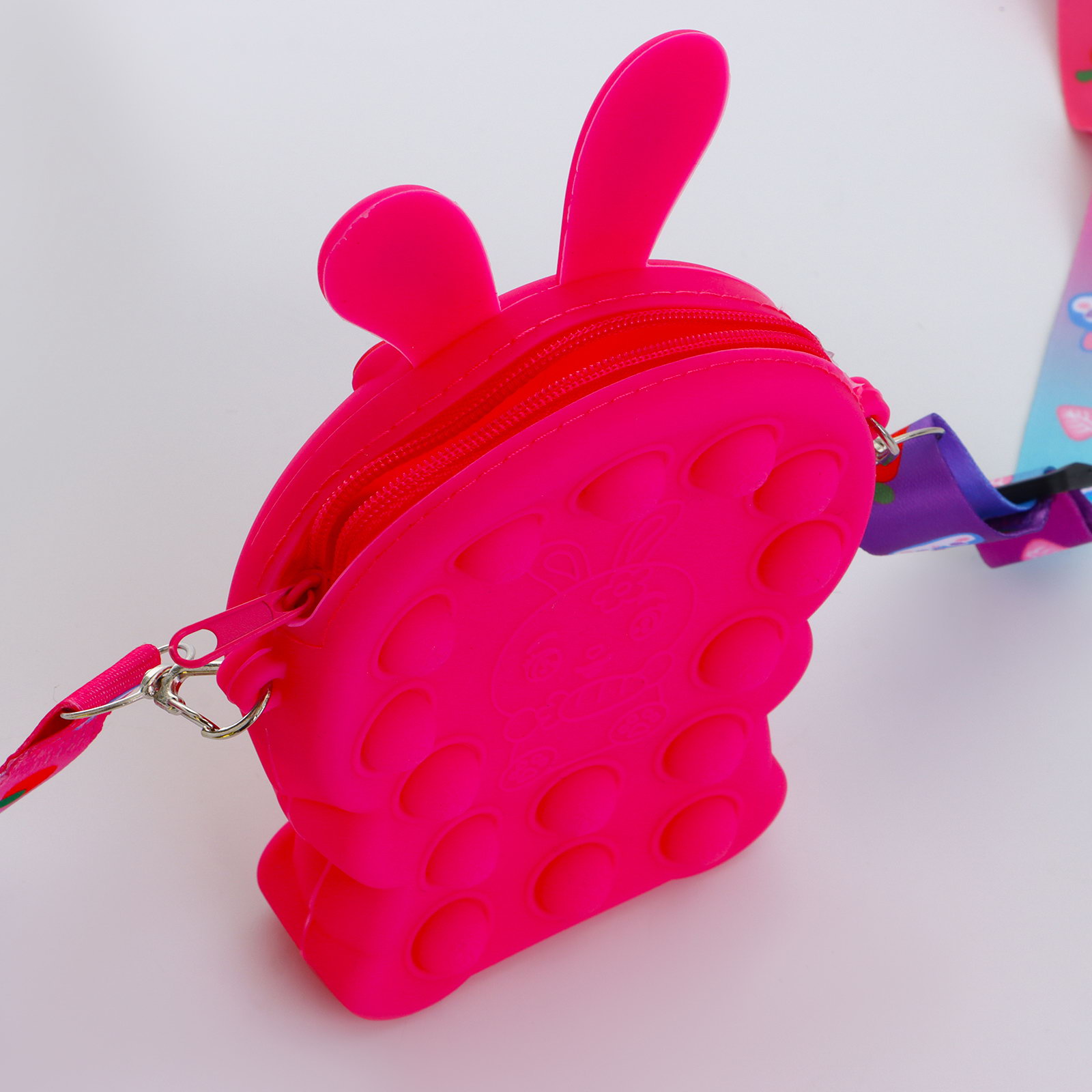 Размер упаковки: 11 x 3 x 14 см. Для кого: Для девочки Особенности: Регулируемый ремень Цвет: Розовый Модель сумки: На длинном ремне Изображение: Заяц/Кролик Вид застёжки: Молния Рисунок: Да Количество отделений: 1 Высота, см: 14 Ширина, см: 3 Длина, см: 11 tnved: 4202921200 Регулируемый ремешок: Да Уникальная детская сумочка порадует маленьких модниц своим ярким малиновым цветом и изображением забавного зайца. Изготовленная из современного силикона, эта сумочка привлечёт внимание и станет отличным аксессуаром для девочек. Распашная молния обеспечивает легкий доступ к её вместительному внутреннему пространству. Преимущества