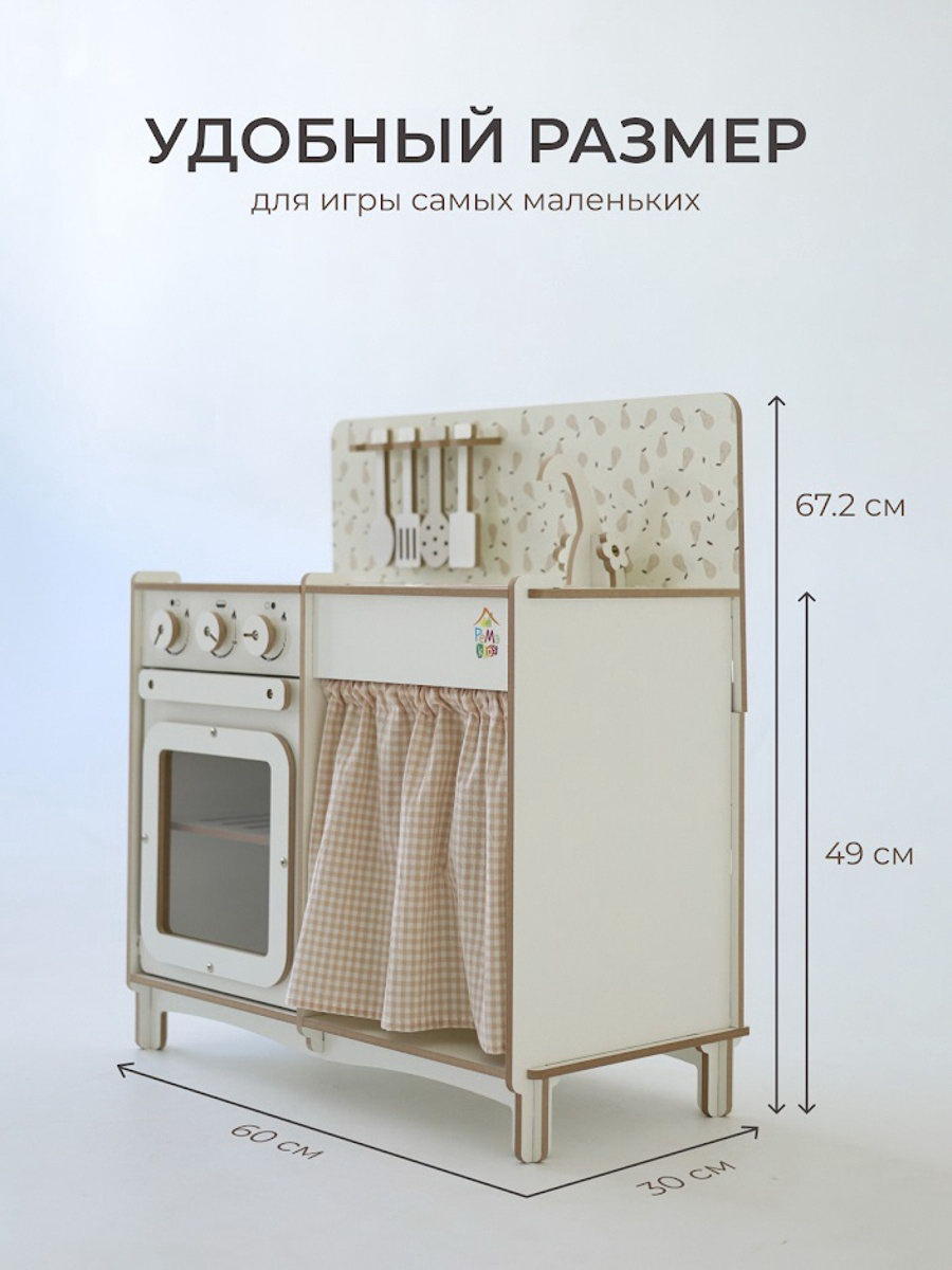 Размер упаковки: 35 x 13 x 64 см. tnved: 9503010000 Температурное ограничение: Нет Назначение: Кухня Возраст: От 3 лет Цвет: Белый Тематика: Детские кухни Для кого: Для девочки Вид: Модули кухни Создайте уютный игровой уголок с детской деревянной кухней стильной, реалистичной и идеально подходящей для первых сюжетных игр. Эта компактная кухня разработана специально для малышей от 3 лет. Она помогает ребёнку повторять знакомые бытовые действия, развивать воображение и играть в ролевые сюжеты в безопасной форме. Благодаря продуманному дизайну и удобной высоте модель подходит даже для небольших детских комнат и легко становится центральным элементом игрового пространства. Корпус выполнен из дерева, устойчив к ежедневным играм и имеет приятную на ощупь поверхность. Варочная панель, духовой шкаф, раковина с краном, крючки для кухонных принадлежностей и текстильная занавеска из 100% хлопка создают атмосферу настоящей кухни и делают игру более реалистичной. Все детали тщательно обработаны, чтобы ребёнку было комфортно и безопасно. Благодаря функциональным элементам кухня помогает развивать мелкую моторику, координацию движений, самостоятельность и умение поддерживать порядок. Это отличный выбор для домашних игр, детских комнат, игровых зон и подарков на любой праздник. Преимущества