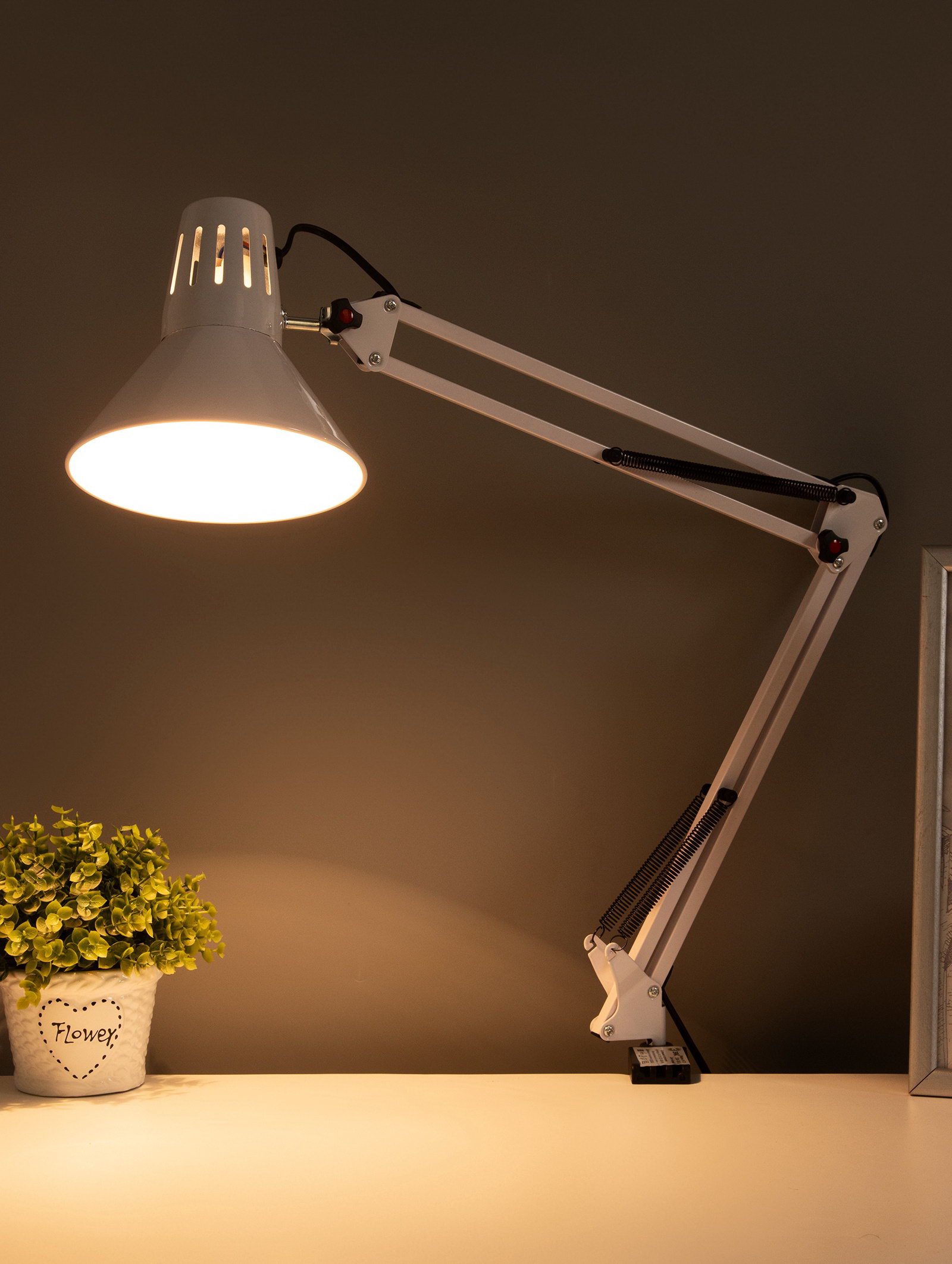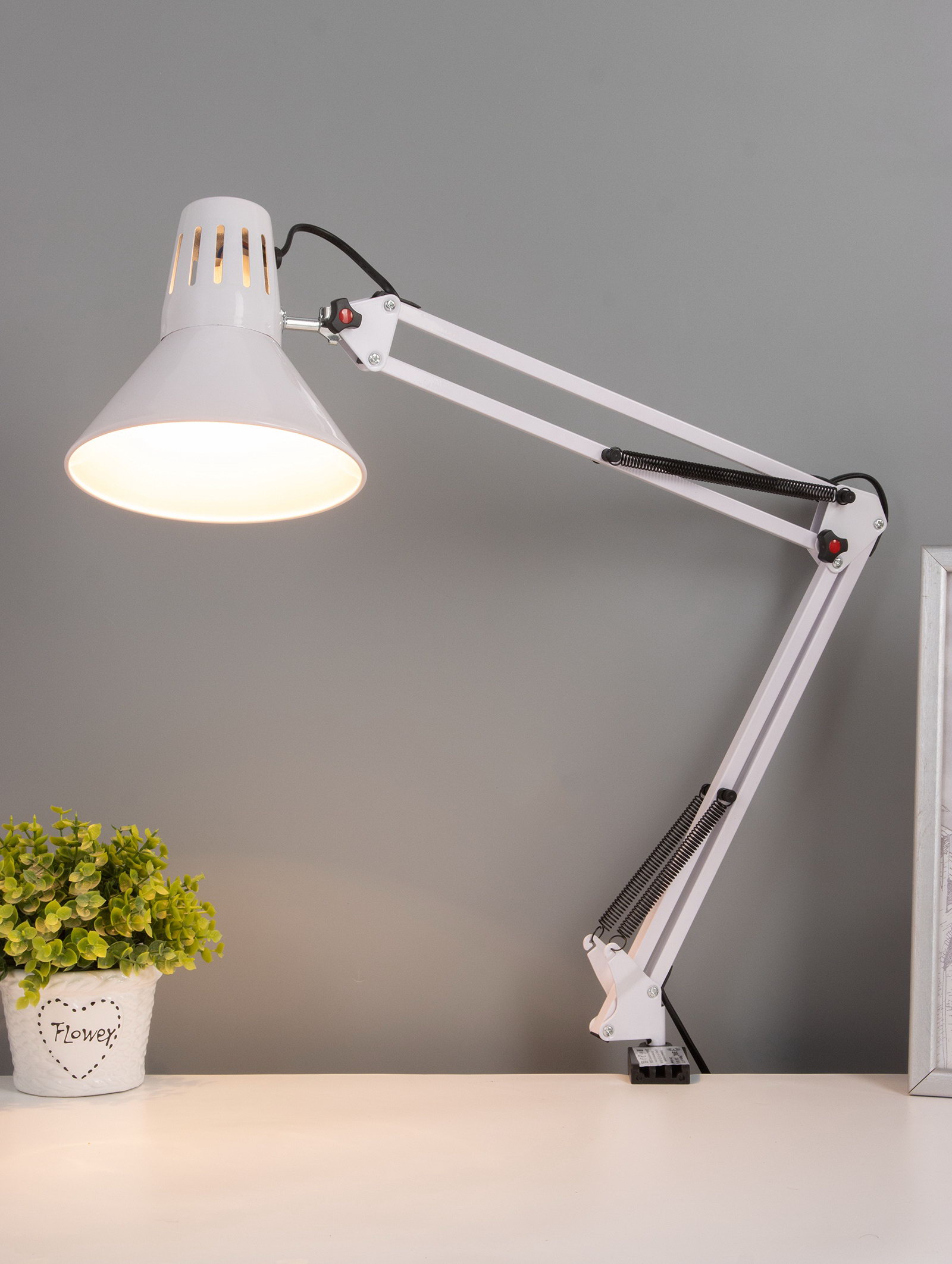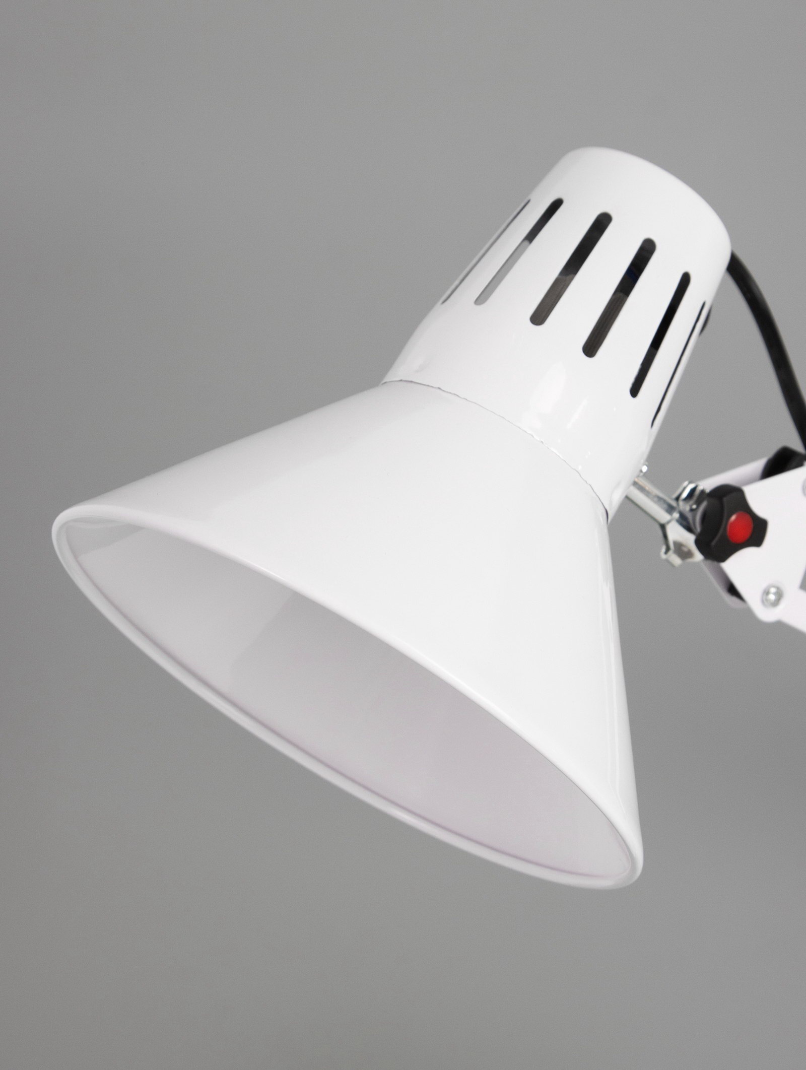 Вид лампы: Накаливания, Светодиодная Размер упаковки: 20 x 10 x 43 см. tnved: 9405290000 Температурное ограничение: Нет Тип питания: От сети 220 В Материал основания: Металл Цвет основания: Белый Управление светильником: С выключателем на проводе Материал рассеивателя: Металл Оттенок рассеивателя: Светлые тона Тип крепления: На струбцине Цоколь: E27 Мощность на цоколь, Вт: 40 Тип рассеивателя: Плафон Высота, см: 85 Длина, см: 17 Особенности светильника: Без особенностей Ширина, см: 45 Количество ламп: 1 Вид: Офисная/Школьная Световой поток, лм: [400,1100] Тип источника освещения: Лампа не в комплекте Цвет рассеивателя: Белый Направление рассеивателя: Поворотное Форма рассеивателя: Конусный Настольная лампа с креплением на струбцине обеспечивает точечное освещение рабочей зоны и помогает рационально использовать пространство стола. Конструкция фиксируется на краю поверхности, освобождая место для работы и сохраняя устойчивость даже при активной эксплуатации. Поворотный механизм и регулируемая высота позволяют направить свет точно туда, где он необходим. Конусный металлический плафон формирует направленный световой поток без лишнего рассеивания, что повышает комфорт при чтении, письме и работе с документами. Металлический корпус отличается прочностью и долговечностью. Белое покрытие визуально облегчает конструкцию и хорошо сочетается с современными интерьерами, создавая аккуратный и нейтральный внешний вид рабочего места. Лампа рассчитана на одну лампу с цоколем E27 мощностью до 40 Вт и совместима с различными типами источников света. Управление осуществляется с помощью выключателя на проводе, что удобно в повседневном использовании. | ||