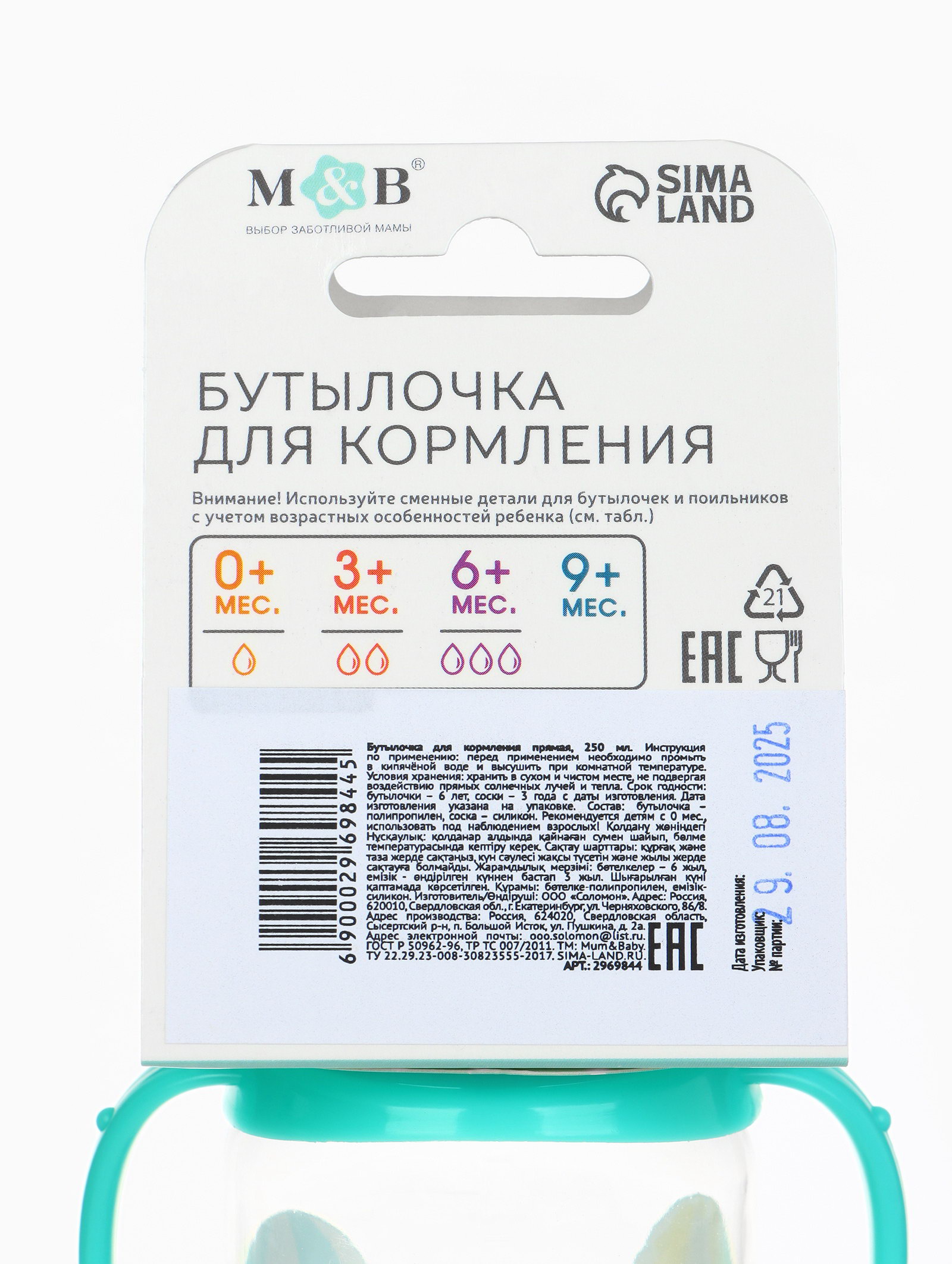 Бутылочка для кормления M&B "Нежное облачно", классическое горло, с ручками, от 3 мес., 250 мл, бирюзовый, 9x5.5x19 см., Mum&Baby, Россия