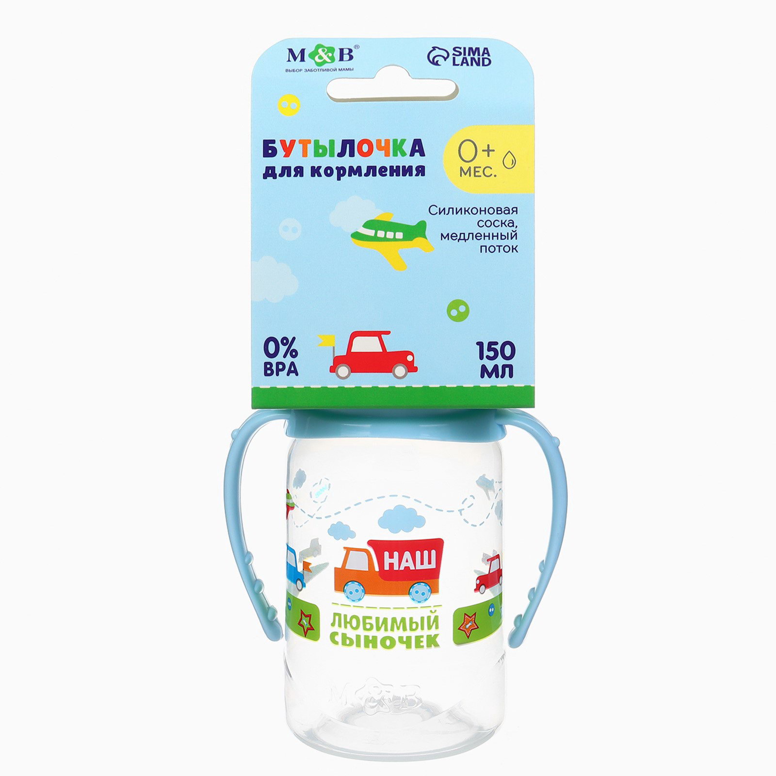 Бутылочка для кормления M&B "Сыночек", классическое горло, с ручками, от 0 мес., 150 мл, голубой, 9x5.5x14 см., Mum&Baby, Россия