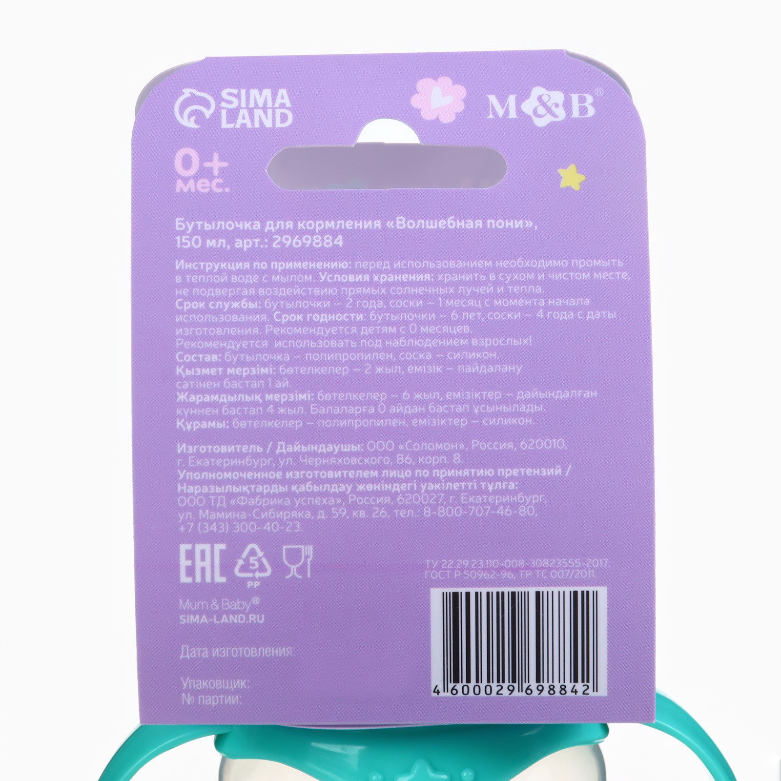 Возраст: Детский, Для детей, От 0 месяцев Размер упаковки: 7.5 x 6 x 17.5 см. Материал соски: Силикон Набор: Нет Скорость потока: Медленный Цвет: Бирюзовый Форма соски: Классическая Для малышей: Да tnved: 3924100000 tnved: 3924100000 Тип горлышка: Стандартное Антиколиковая система: Нет Эксклюзивный дизайн: Да Температурное ограничение: Нет Для детей до 3 лет: Да С ручками: Да Русская упаковка: Да Съёмная ручка: Да Рисунок: Да Пластиковая бутылочка мало весит, поэтому её удобно давать ребёнку. Износостойкий материал прослужит около 2 лет. Особенности Силиконовая соска не имеет вкуса и запаха. Средний поток оптимален для молока, молочных смесей, воды и чая. Рёбра жёсткости соски не дают ей сминаться во время кормления. Кольцо бутылочки имеет рельефные элементы, имитирующие ареолы груди. Выпуклая мерная шкала помогает точно определить объём питания. Эргономичная форма ёмкости разработана специально для удобного захвата. Изделие не содержит бисфенол А. Детская бутылочка изготовлена в России из сырья отечественного производства. Все материалы сертифицированы и безопасны для здоровья новорождённых. Полипропилен и силикон не выделяют вредных веществ при стерилизации и контакте с жидкостью. | ||