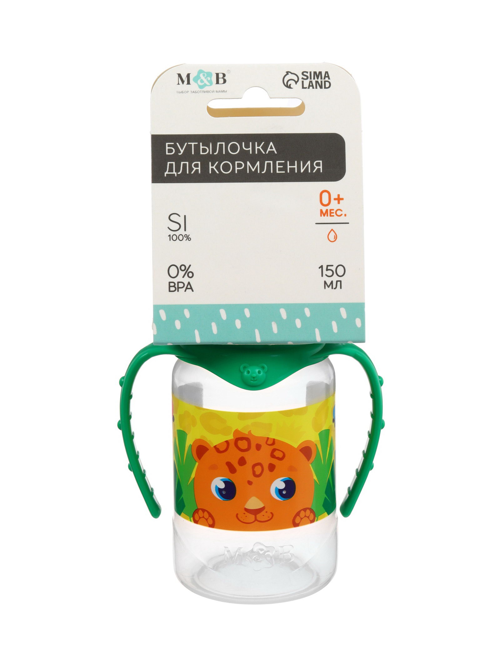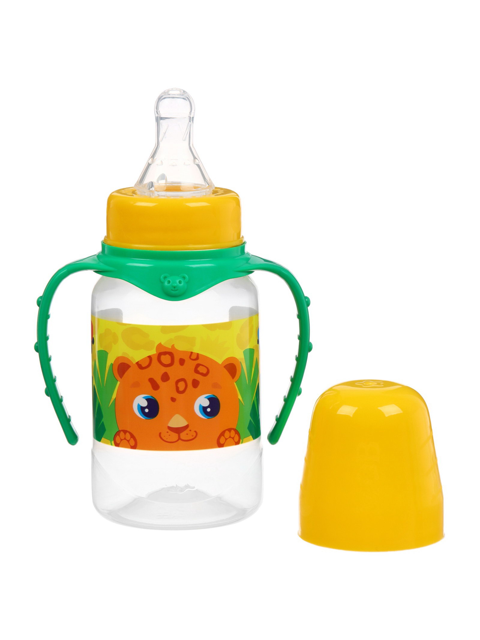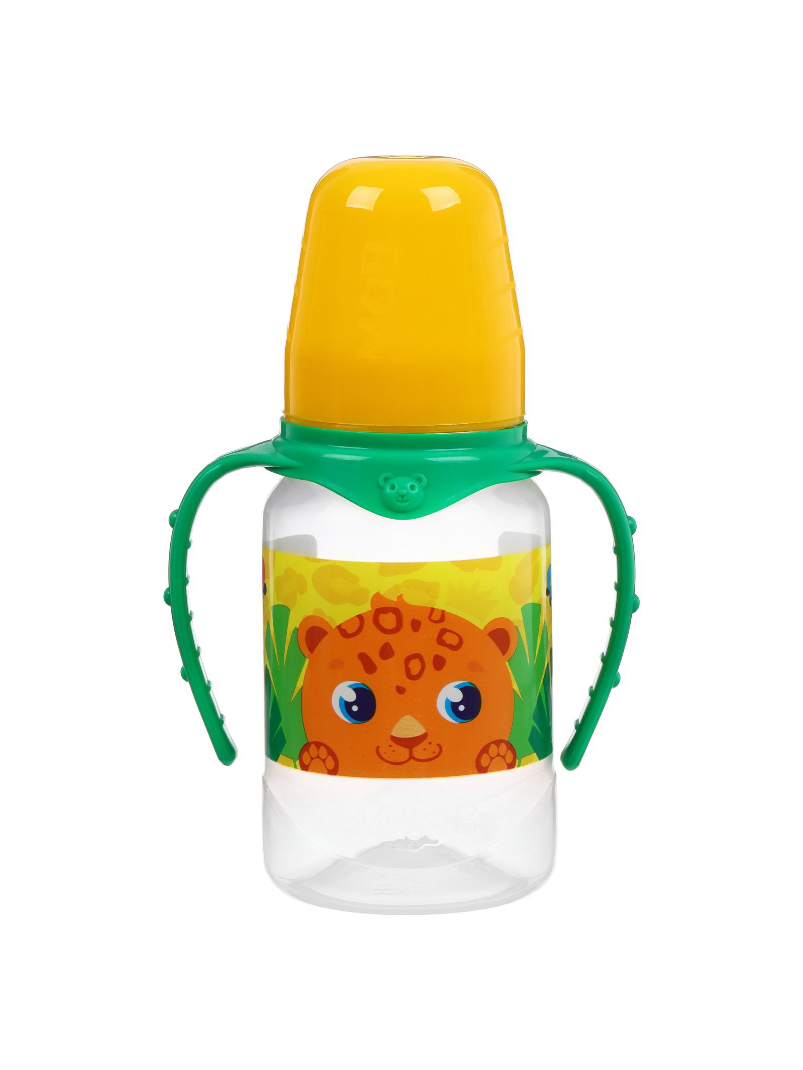 Бутылочка для кормления малыша M&B "ТРЕНД. Леопард", классическое горло, с ручками, от 3 мес., 150 мл, цилиндр, цвет желтый, 9x5.5x14 см., Mum&Baby, Россия