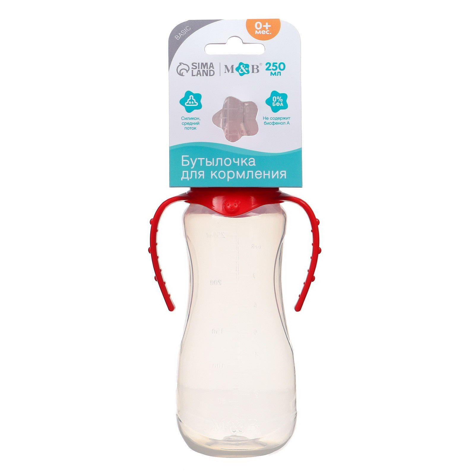 Бутылочка для кормления M&B, классическое горло, с ручками, от 0 мес., 250 мл, приталенная, МИКС, 9x5.5x19 см., Mum&Baby, Россия