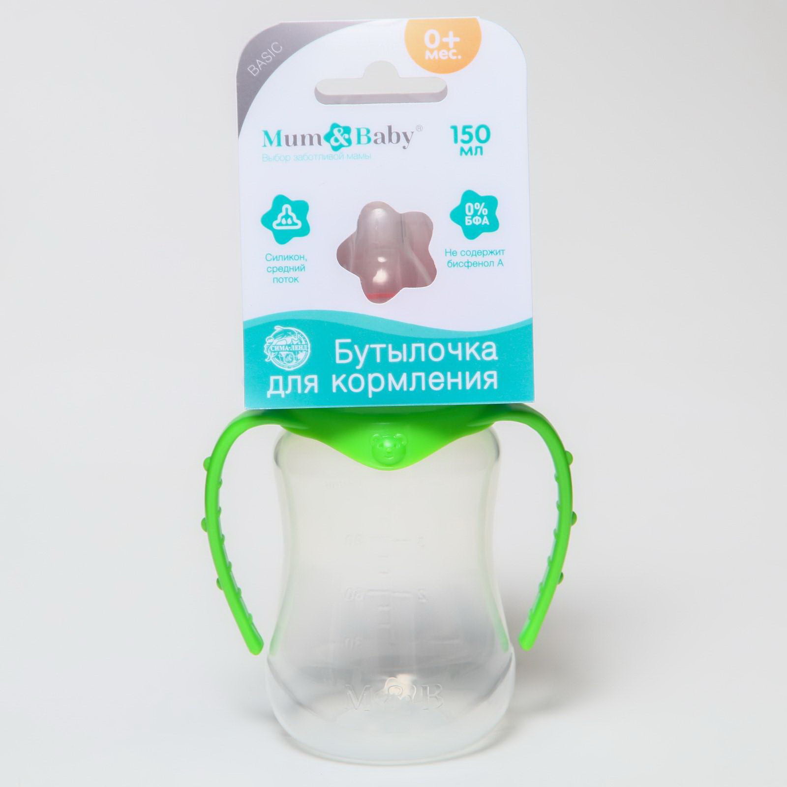 Бутылочка для кормления M&B, классическое горло, с ручками, от 0 мес., 150 мл, приталенная, цвет МИКС, 9x5.5x14 см., Mum&Baby, Россия
