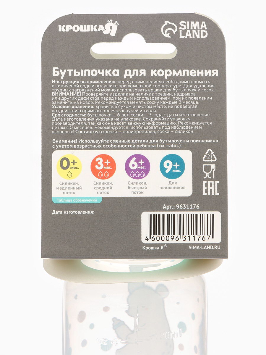 Возраст: Детский, Для детей, От 0 месяцев Размер упаковки: 6 x 5.5 x 17 см. Материал соски: Силикон Тип горлышка: Стандартное Набор: Нет Антиколиковая система: Нет С ручками: Нет Скорость потока: Медленный Съёмная ручка: Да Для детей до 3 лет: Да Рисунок: Да Русская упаковка: Да Эксклюзивный дизайн: Да Цвет: Голубой Для малышей: Да Форма соски: Классическая Форма соски: Классическая tnved: 3924100000 | ||