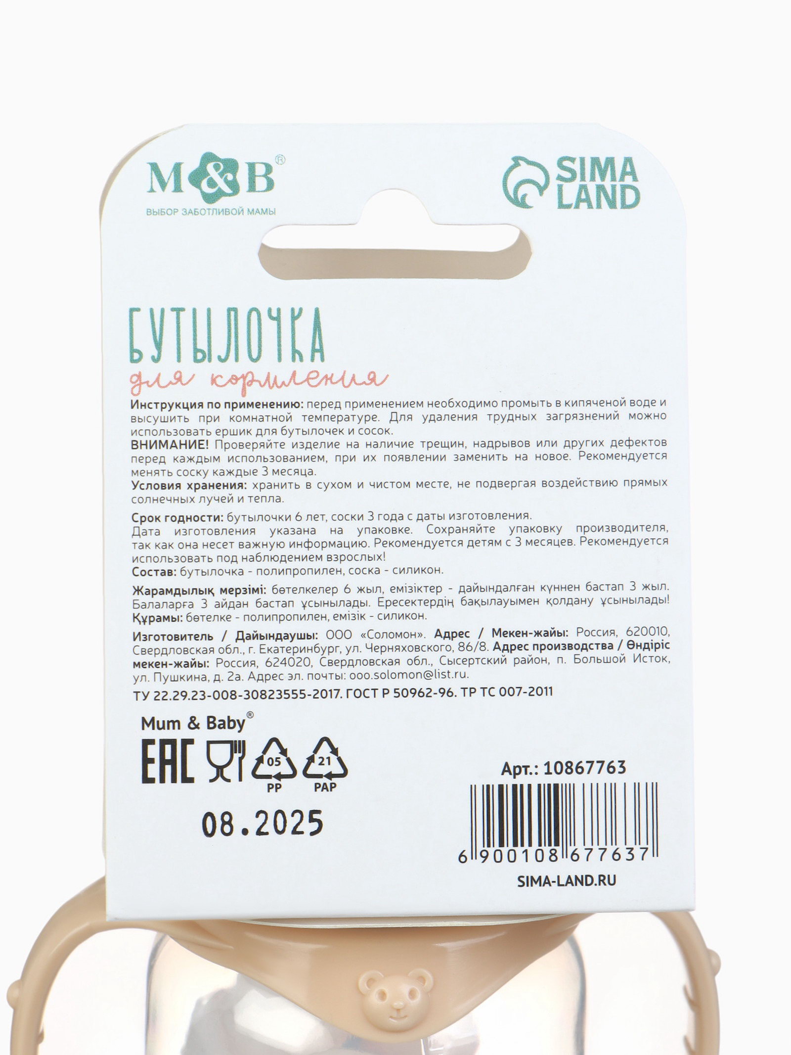 Бутылочка для кормления, новогодняя, Baby Bear, 250 мл, цилиндр, бежевый, 250 мл., Mum&Baby, Россия