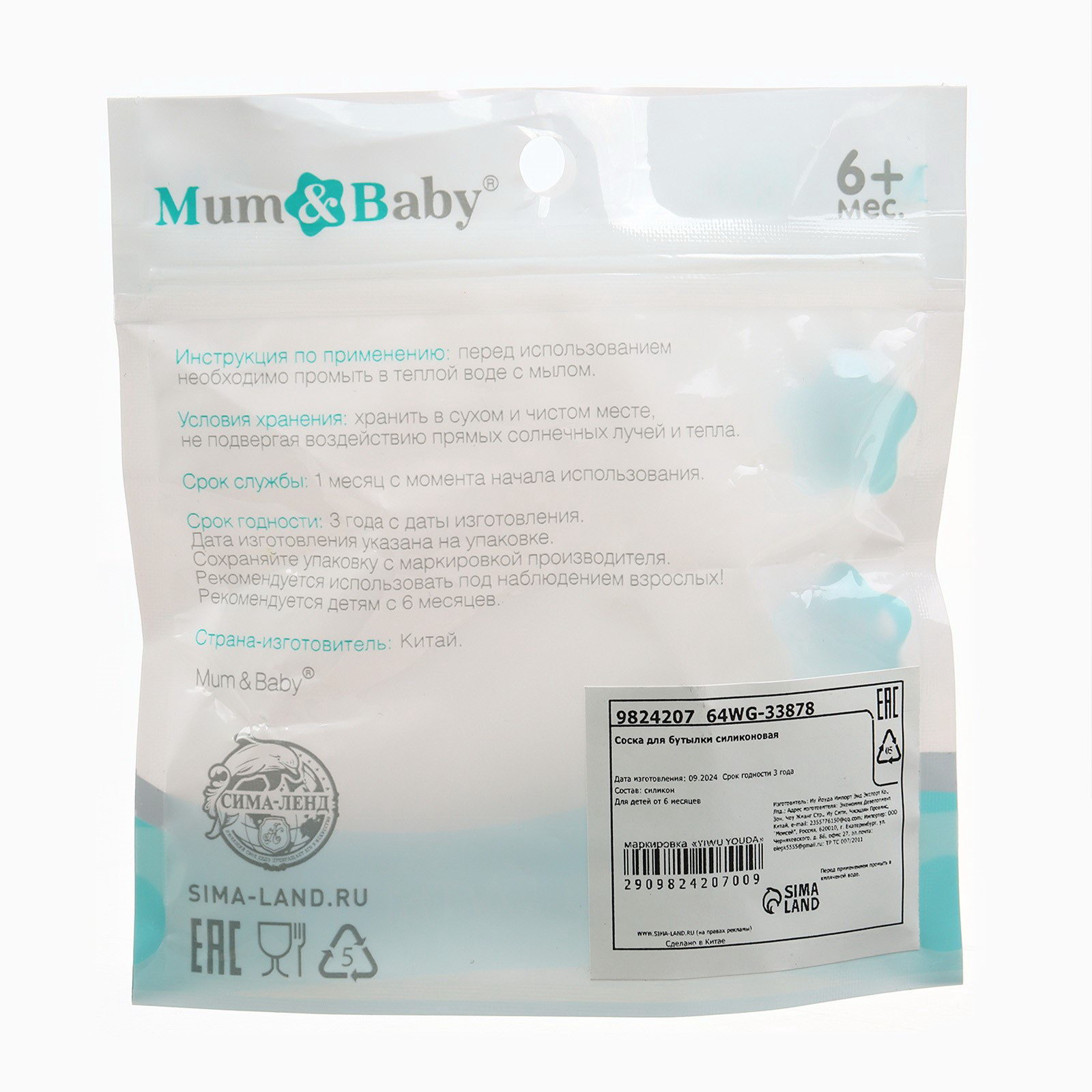 Соска на бутылочку M&B Natural, антиколиковая, от 6 мес., 5.5x5.5x4.5 см., Mum&Baby, Китай