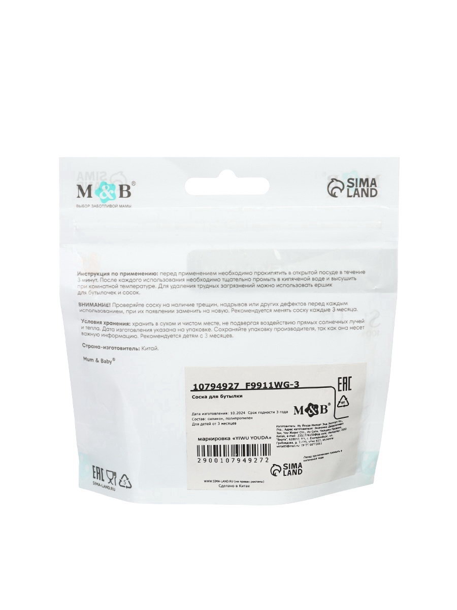 Соска для бутылочки силиконовой M&B, антиколиковая, +3мес., ШГ ?70 мм, 7x7x5 см., Mum&Baby, Китай