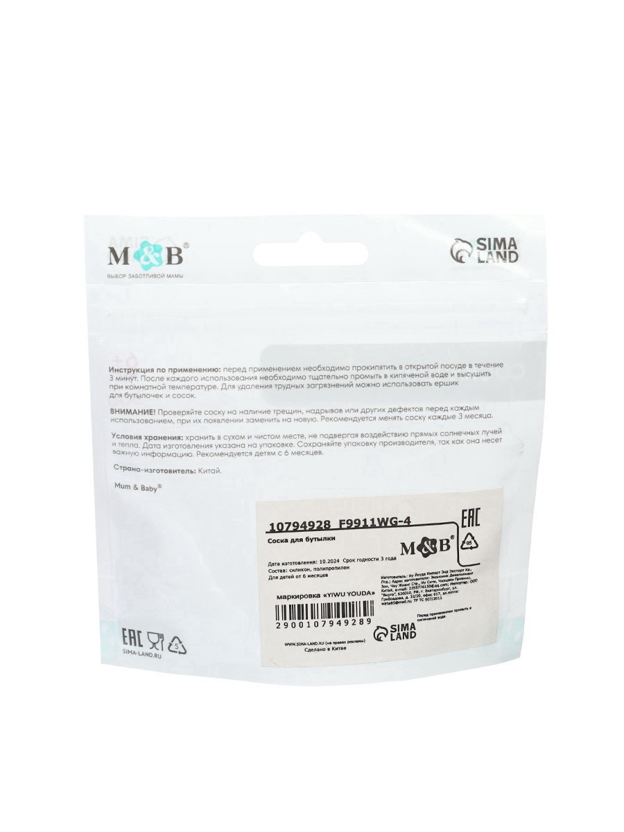 Соска для бутылочки силиконовой M&B, антиколиковая, +6мес., ШГ ?70 мм, 7x7x5 см., Mum&Baby, Китай