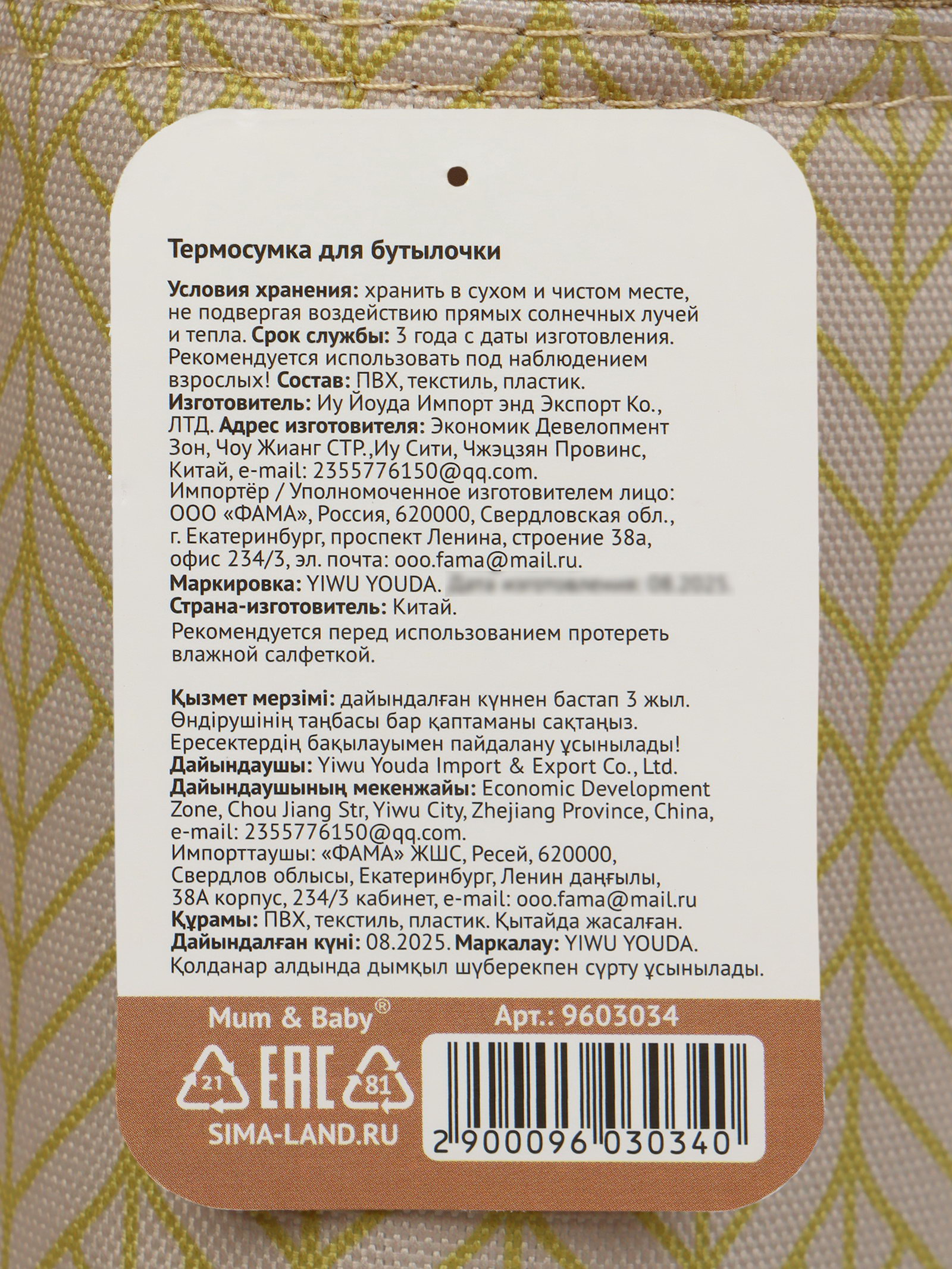 Термосумка для бутылочки "Sand", форма тубус, 7.5x19x7.5 см., Mum&Baby, Китай