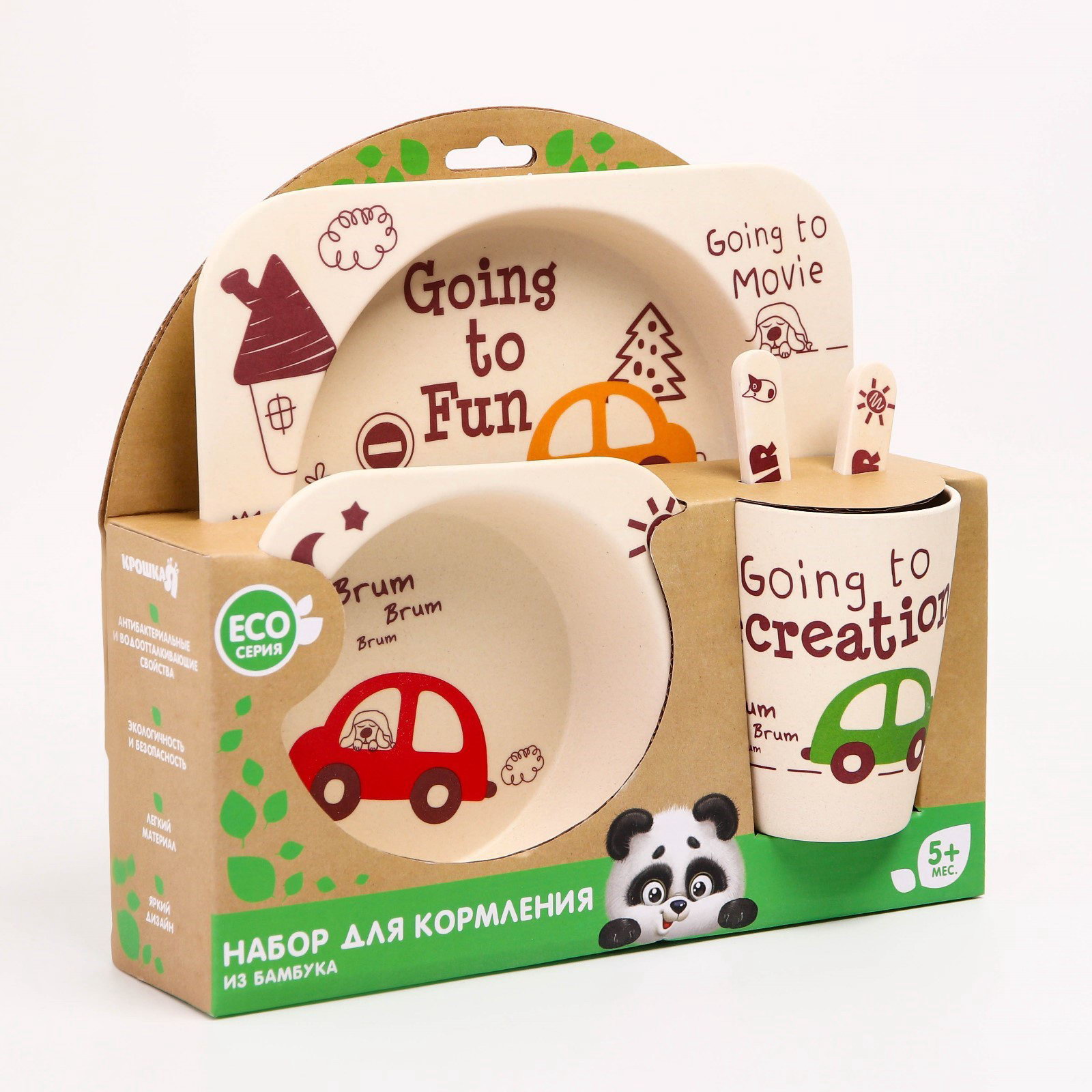 Детская посуда из бамбука в наборе "Машинки", тарелка, миска, стакан, приборы, 5 предметов, 25x23x10 см., Крошка Я, Китай