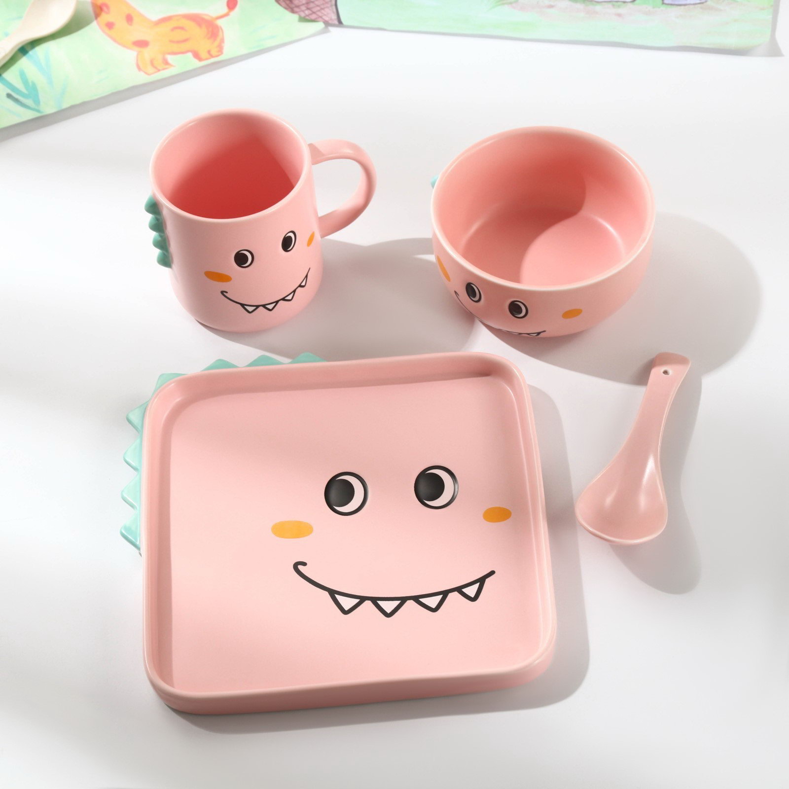 Набор детской посуды из керамики "Дино", 4 предмета: блюдо 19.5x20.5 см, миска 350 мл, кружка 350 мл, ложка, цвет розовый, 19.5x19.5x8.8 см., Китай
