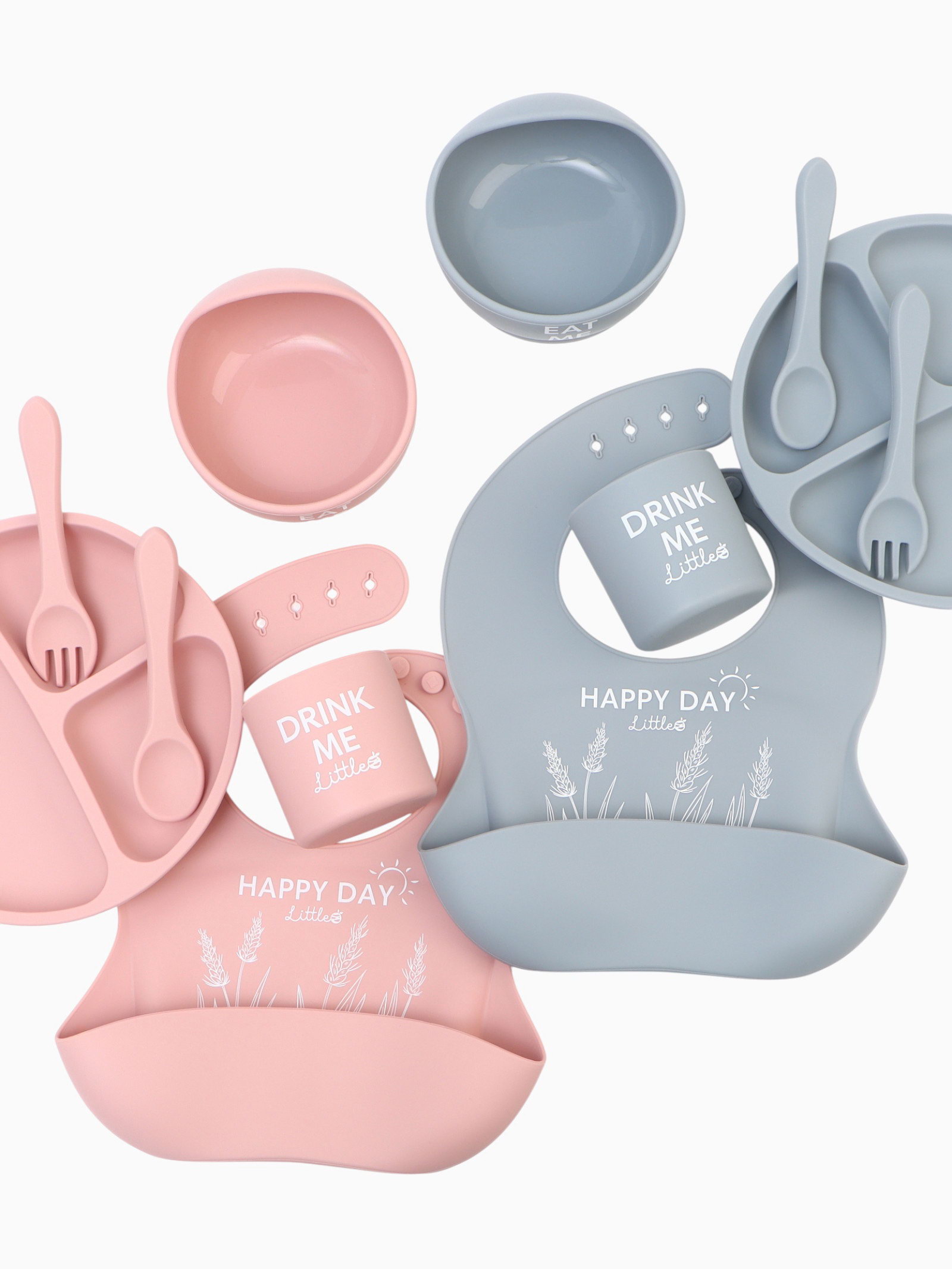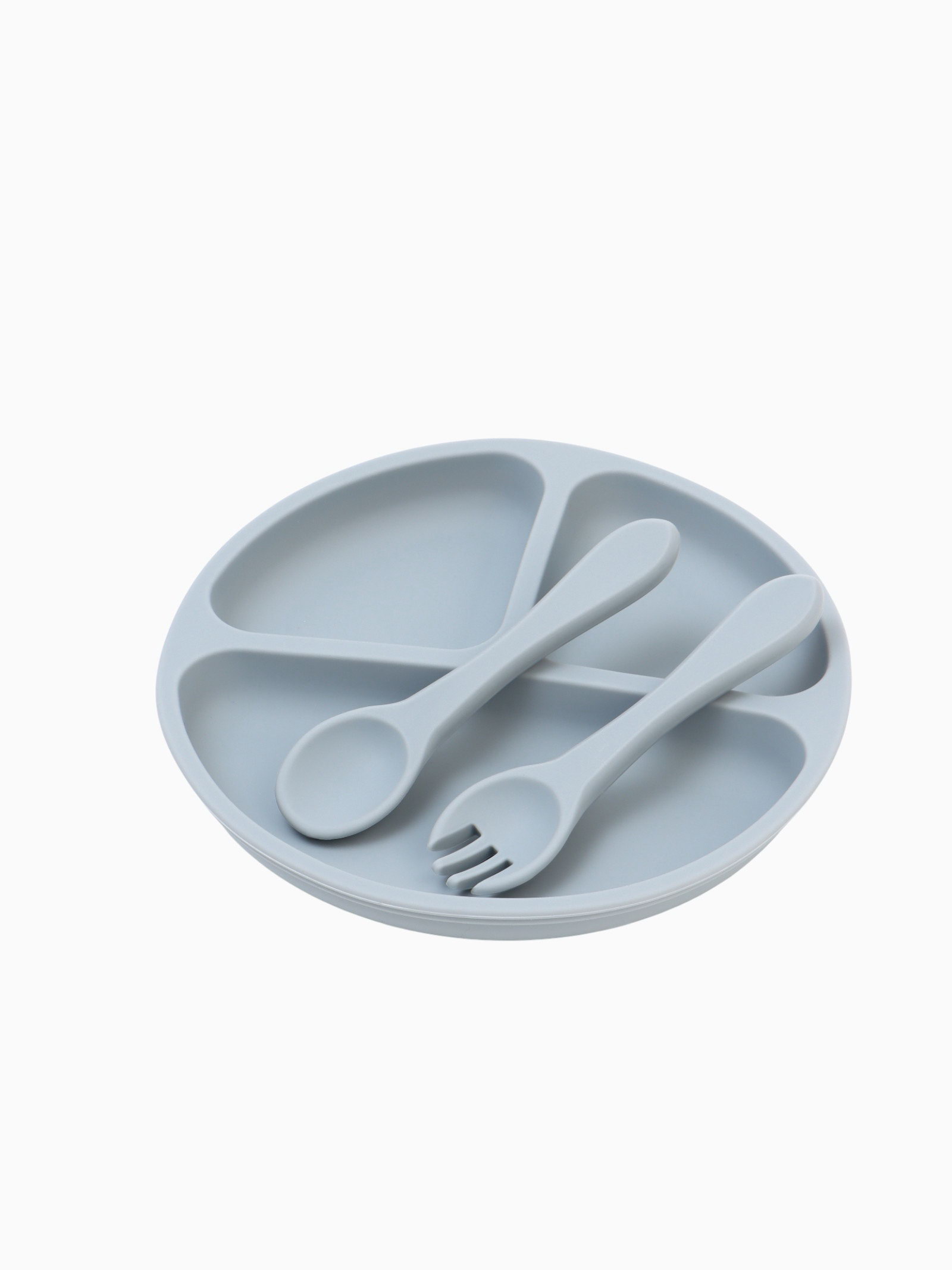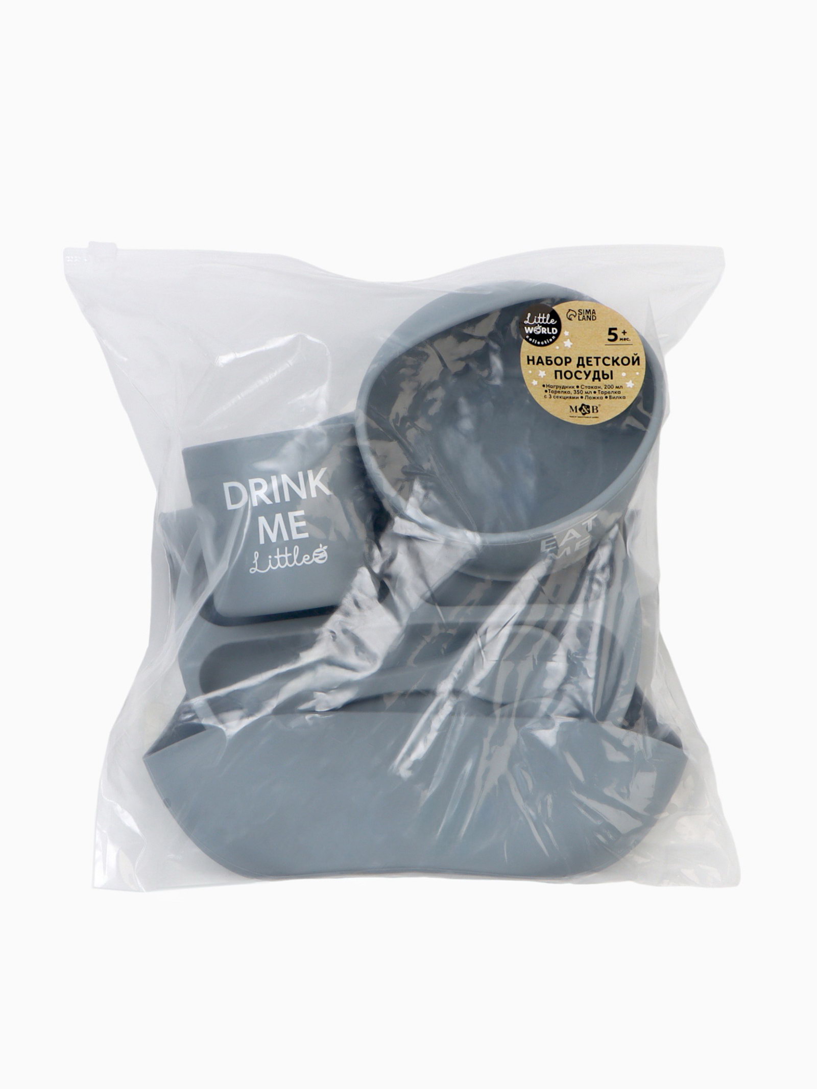Детская посуда в наборе: нагрудник, тарелка 2 шт., стакан, приборы, M&B, силикон, серый, 29x23x9 см., Mum&Baby, Китай