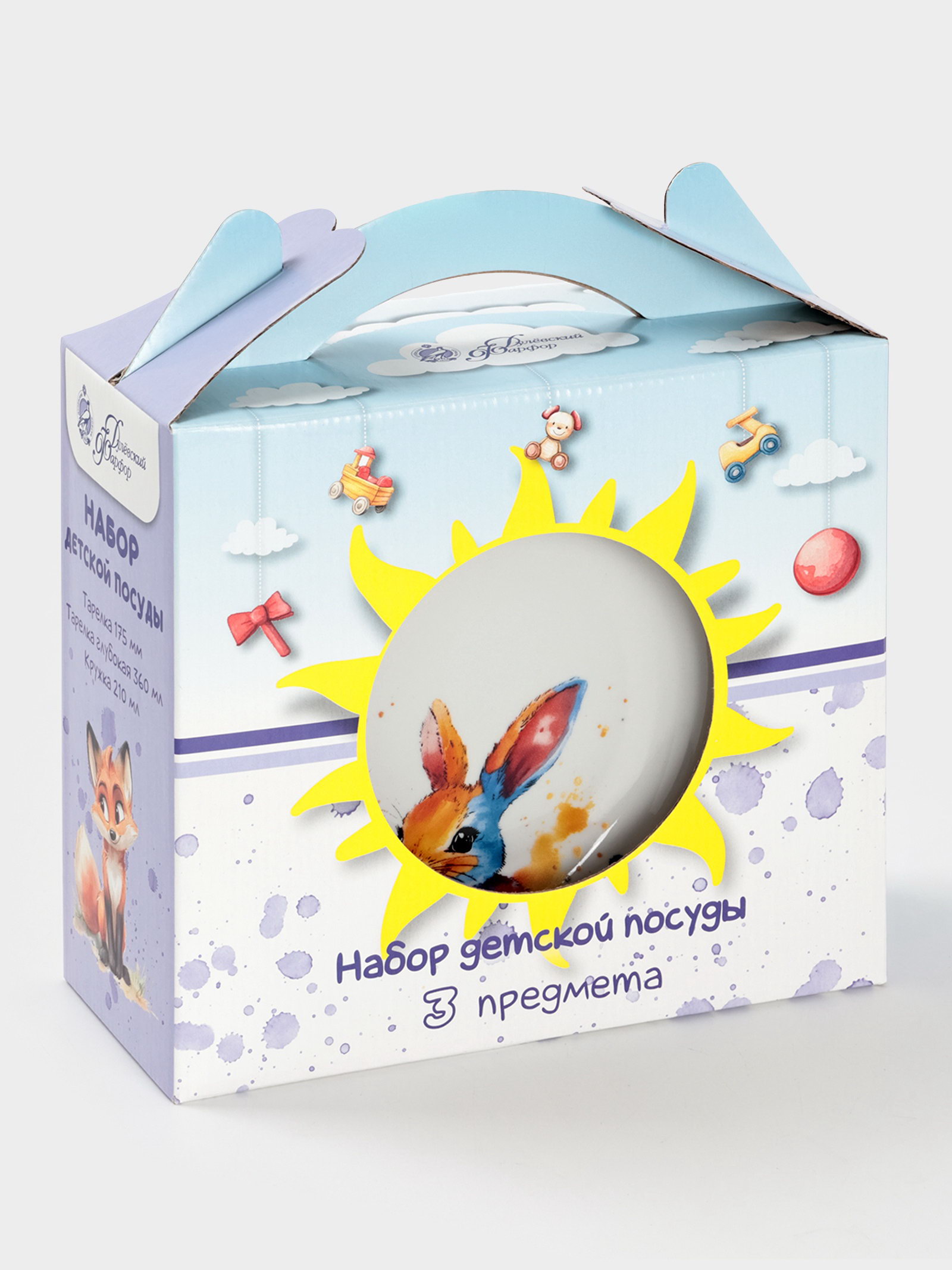 Размер упаковки: 20.5 x 18.5 x 9 см. Для детей до 3 лет: Нет В наборе, шт.: 3 Можно мыть в посудомоечной машине: Да Можно использовать в СВЧ-печи: Да Цвет: Белый Рисунок: Да Текстура: Гладкая Особенности: Деколь Количество персон: 1 Тематика: Животный мир Матовая поверхность: Нет tnved: 6911100000 Набор детской посуды с зайчиком из дулевского фарфора это практичный и стильный выбор для повседневных трапез. Подходит для детей старше трёх лет, он включает тарелку (175 мл), миску (360 мл) и кружку (210 мл). Белый цвет и очаровательный рисунок делают этот комплект универсальным и привлекательным для ежедневного использования. Особенности