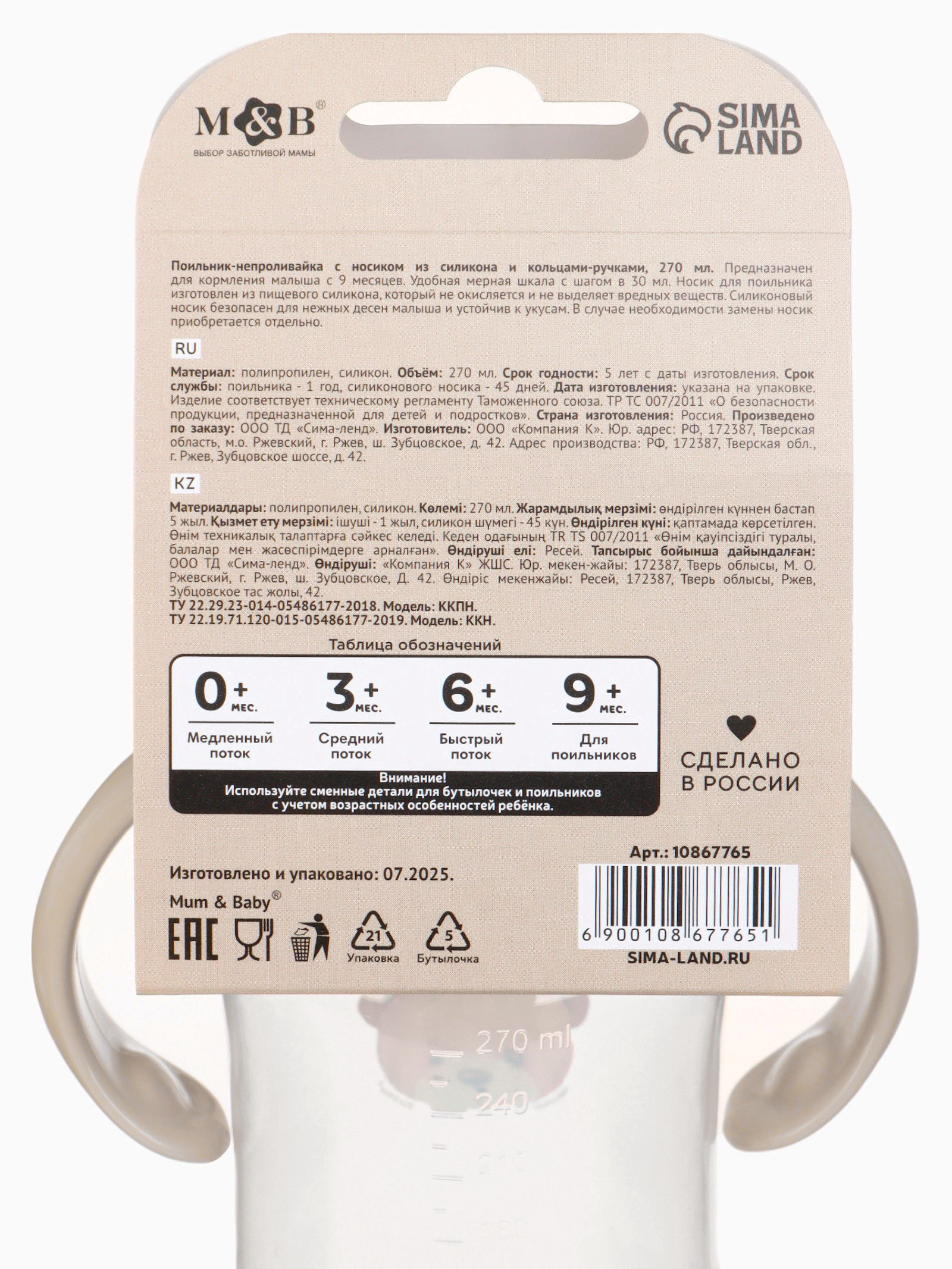 Поильник - непроливайка Baby Bear с силиконовым носиком, 270 мл, бежевый, 270 мл., Mum&Baby, Россия