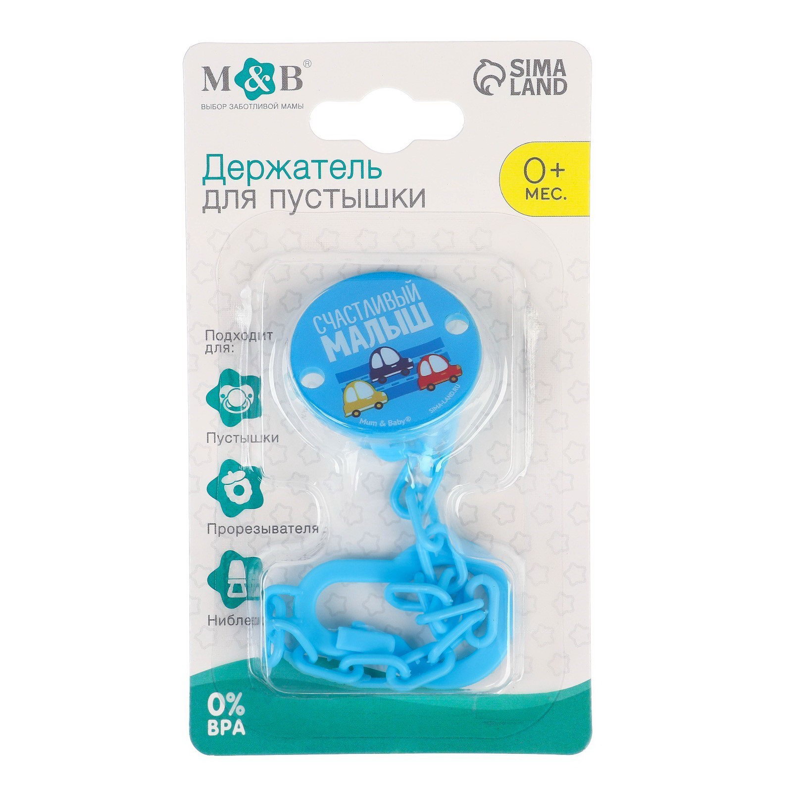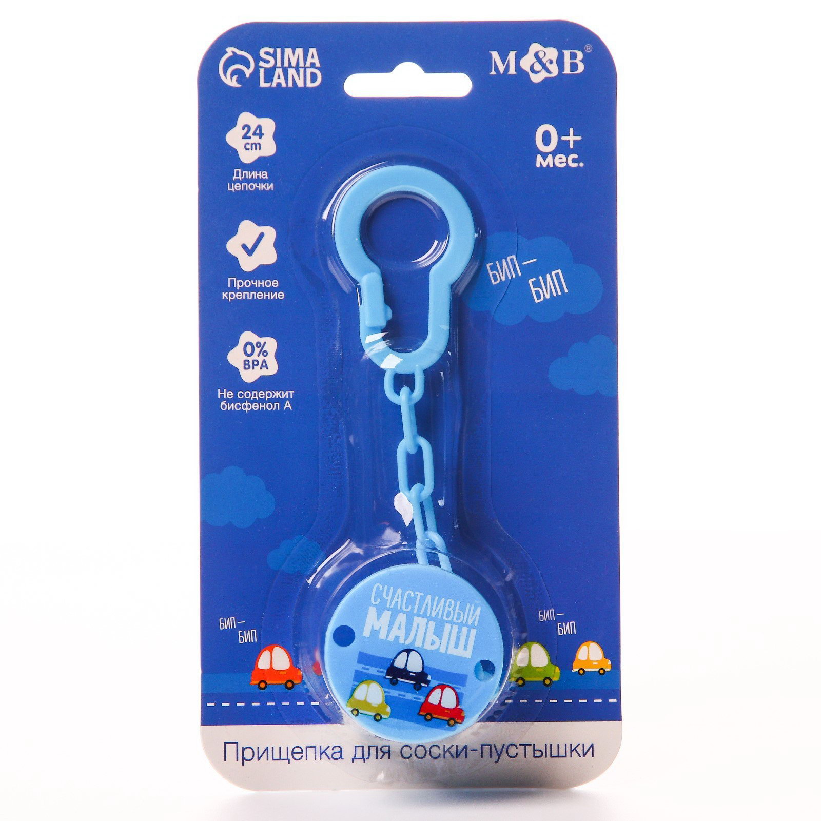 Держатель для соски - пустышки "Счастливый малыш", на цепочке, цвет синий, 10x18x0.3 см., Mum&Baby, Китай