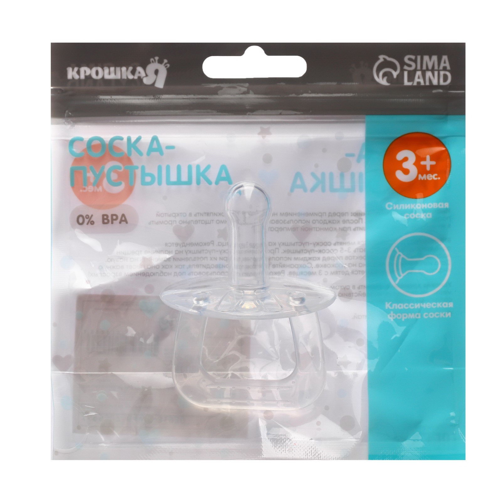 Соска - пустышка цельносиликоновая классическая от 3 мес., цвет прозрачный, 5x5x7 см., Крошка Я, Китай