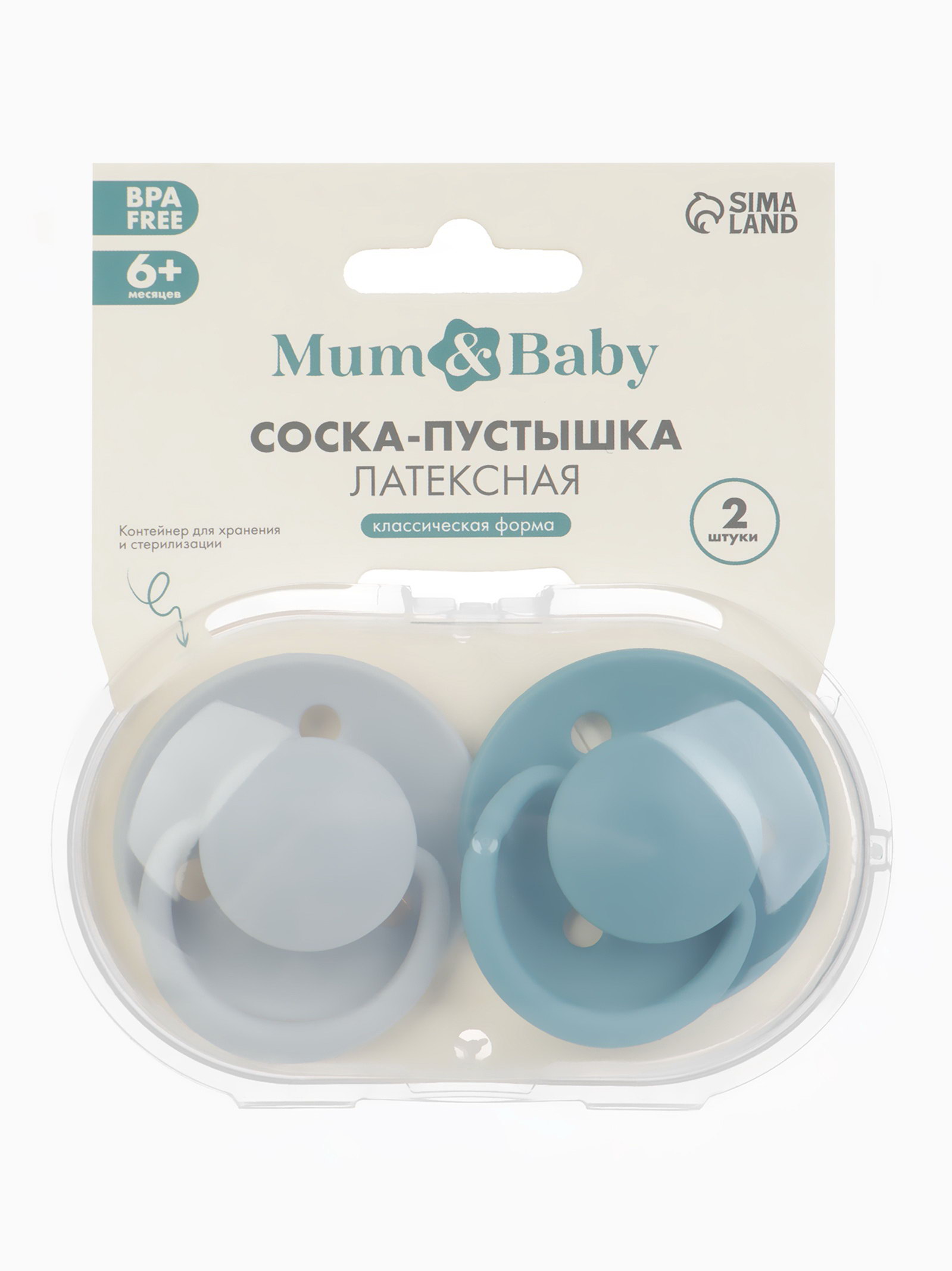 Соски-пустышки, от 6 мес., латекс, классические, в контейнере, набор из 2 шт., серый/серо-синий, M&B, 4.7x10.5x12.5 см., Mum&Baby, Китай