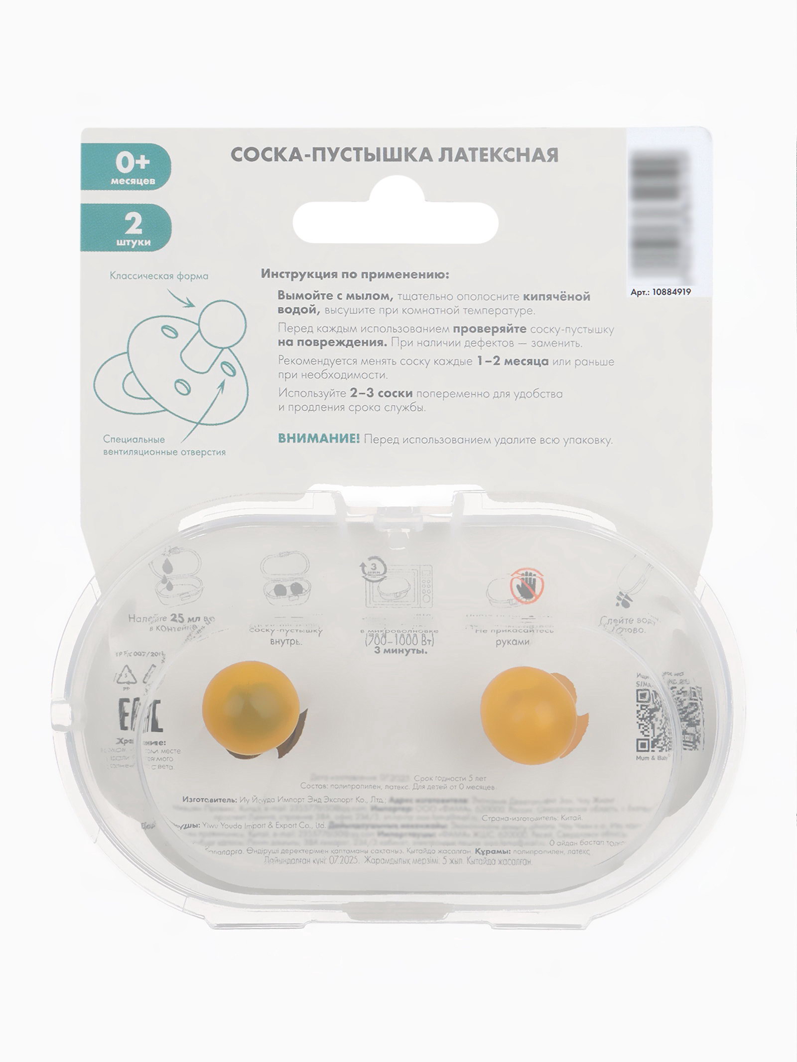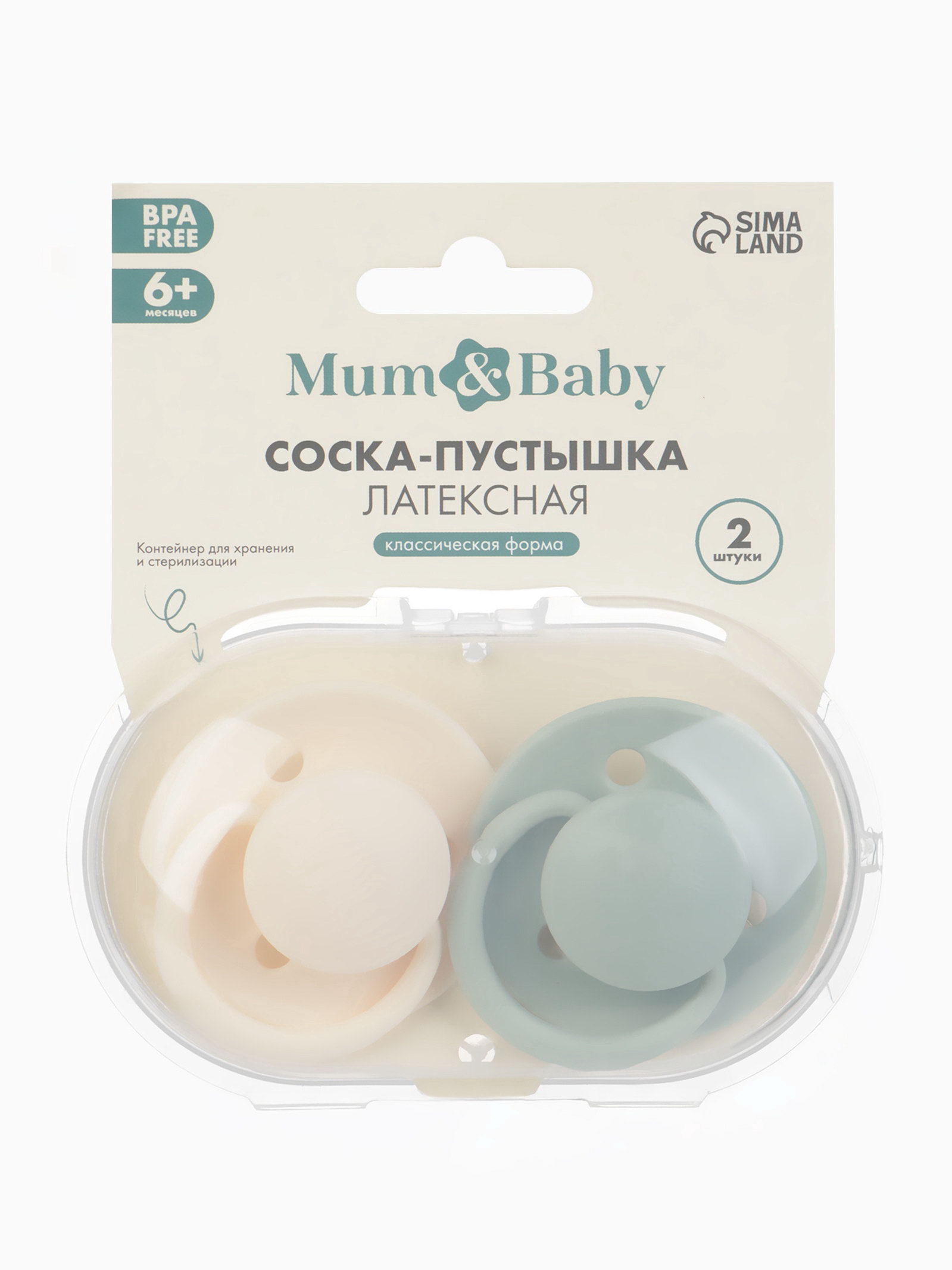 Соски-пустышки, от 6 мес., латекс, классические, в контейнере, набор из 2 шт., айвори/зелёный, M&B, 4.7x10.5x12.5 см., Mum&Baby, Китай