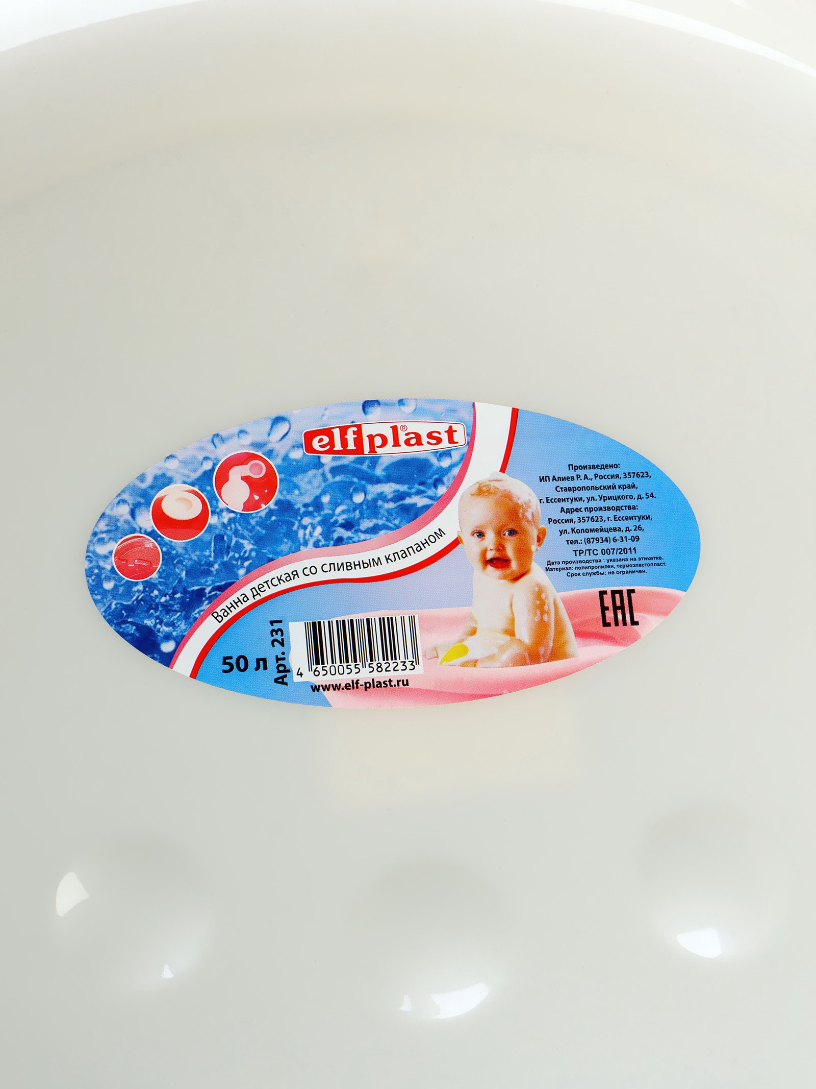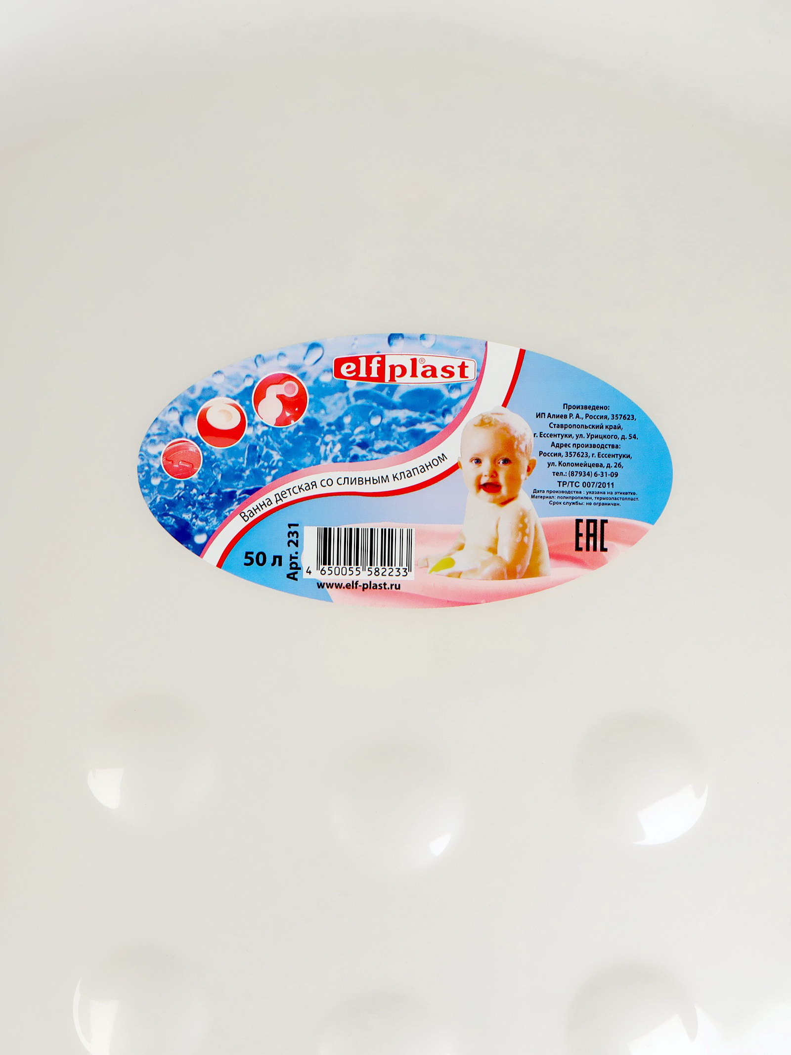 Ванночка для купания, детская со сливным клапаном 50 л, бела, 96x49x26 см., elf-plast, Россия