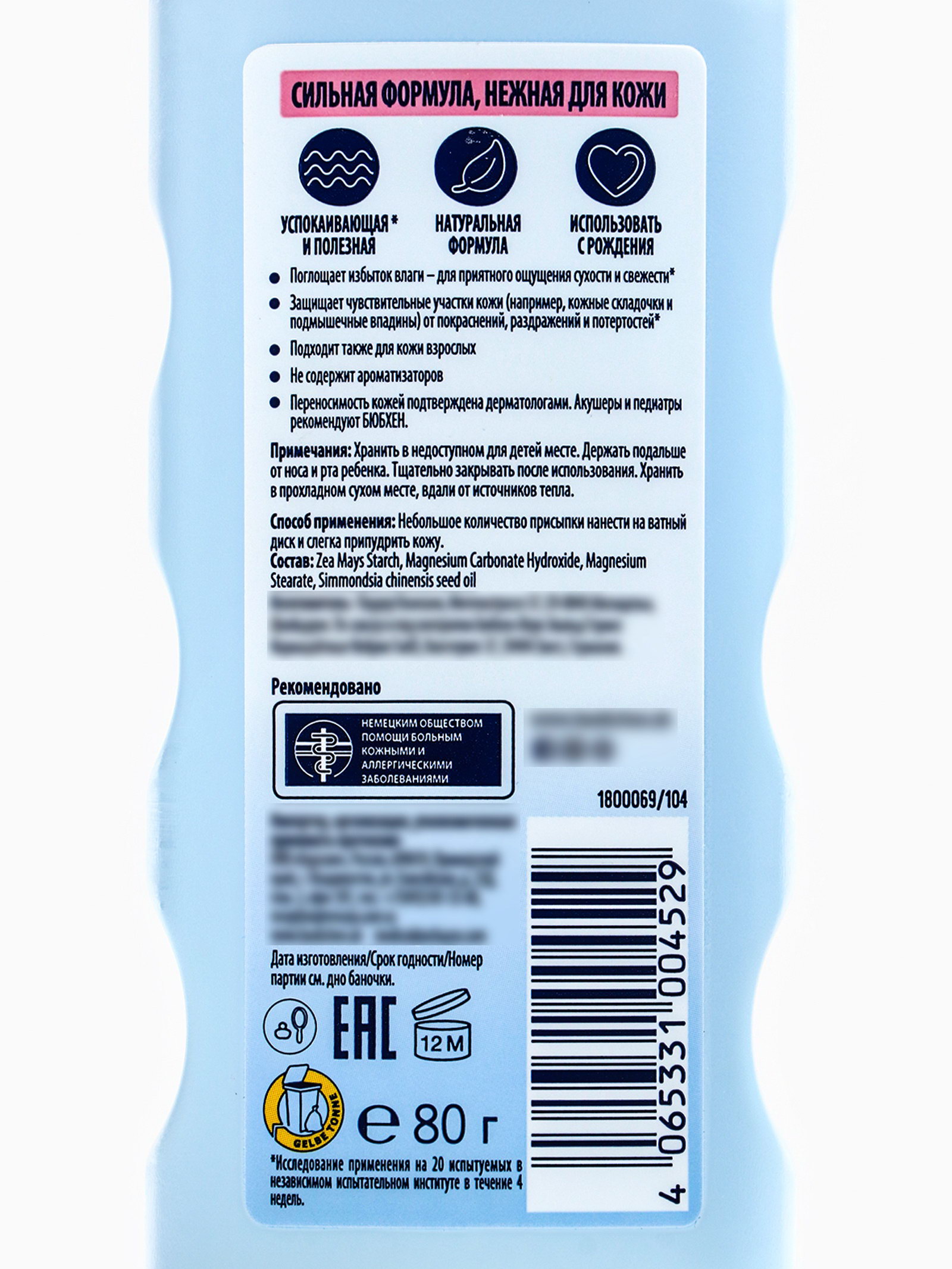 Размер упаковки: 5 x 14 x 5.5 см. tnved: 3304990000 Температурное ограничение: Нет Температурное ограничение: Нет Вес, г: 80 Вид: Присыпка Вес, г/Объём, мл: 80 Нежная присыпка B?bchen создана для бережного ухода за чувствительной кожей малышей с первых дней жизни. Она помогает поддерживать кожу сухой, защищает от раздражений и покраснений, снижает риск появления опрелостей. Лёгкая текстура равномерно распределяется, не закупоривает поры и обеспечивает ощущение комфорта. Подходит для ежедневного использования после купания и смены подгузника. Присыпка SOS поглощает избыток влаги и придает коже приятную сухость и свежесть*. Натуральная формула защищает чувствительные участки кожи от покраснений, раздражений и потертостей*. Кукурузный крахмал и масло жожоба - чудодейственные ингредиенты, впечатляющие своим увлажняющим действием. Состав: Zea Mays Starch, Magnesium Carbonate Hydroxide, Magnesium Stearate, Simmondsia Chinensis Seed Oil. Специальные особенности: • с кукурузным крахмалом и маслом жожоба • без талька • рН нейтрально для кожи • без минеральных масел • без парабенов • без силикона • без красителей • без микропластика • веганский продукт • переносимость подтверждена дерматологами Результат: Надежная защита после купания или смены подгузника. Благодаря успокаивающему эффекту подходит и для ухода за кожей взрослых. Противопоказания к применению: индивидуальная непереносимость. При появлении каких-либо раздражений или аллергических реакций немедленно прекратить использование. Способ применения: небольшое количество присыпки нанести на тампон/ватный диск и слегка припудрить кожу. | ||