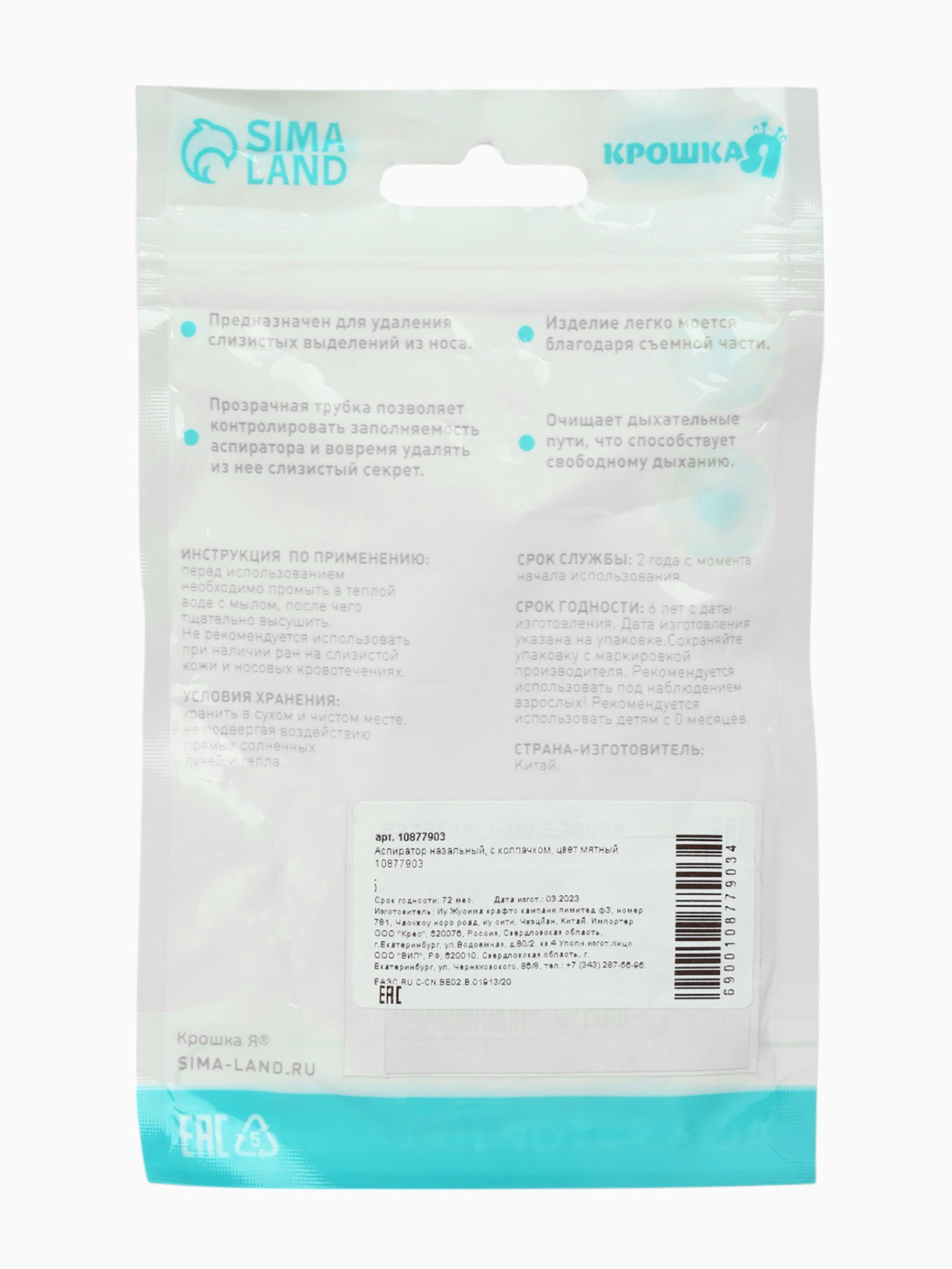 Аспиратор назальный, с колпачком, цвет мятный, Крошка Я, Китай