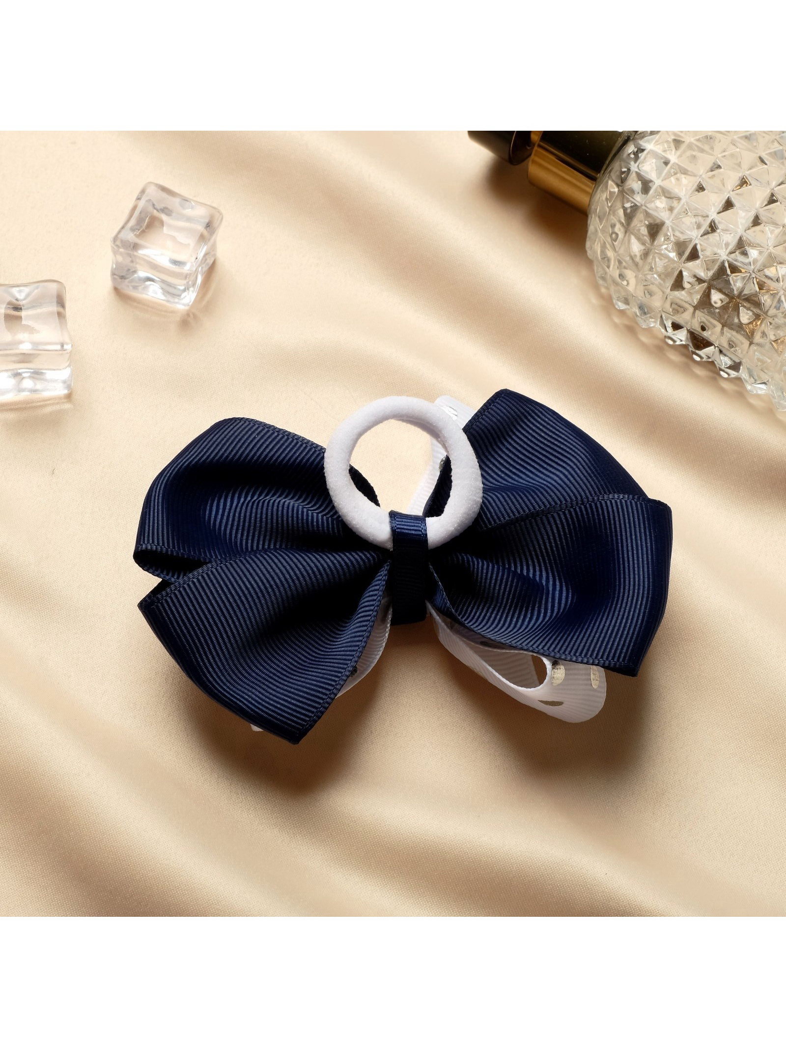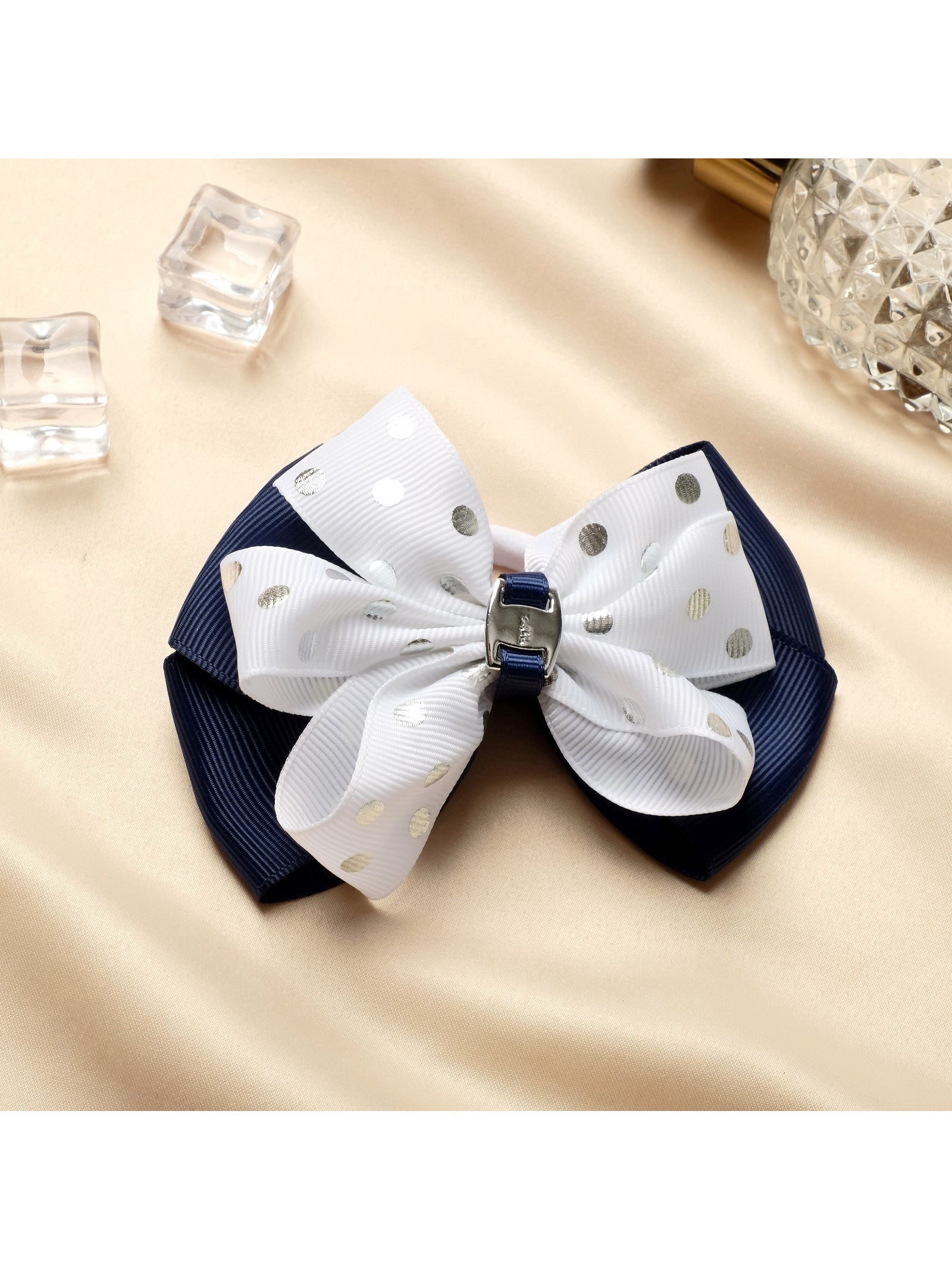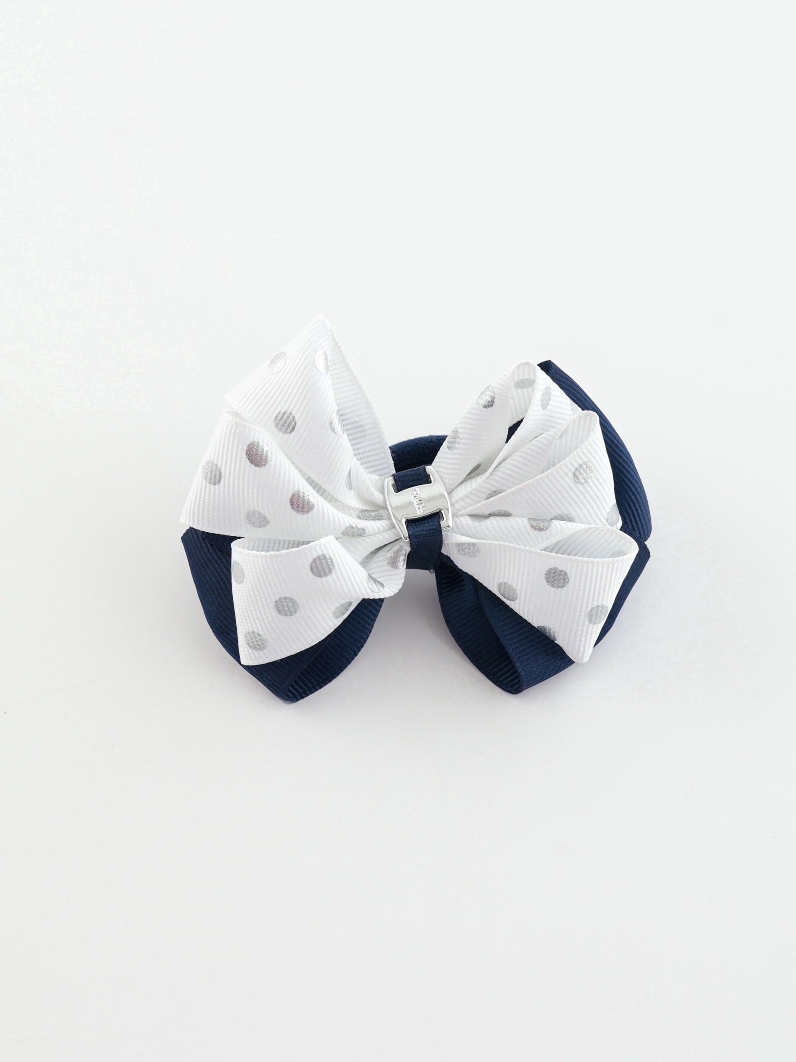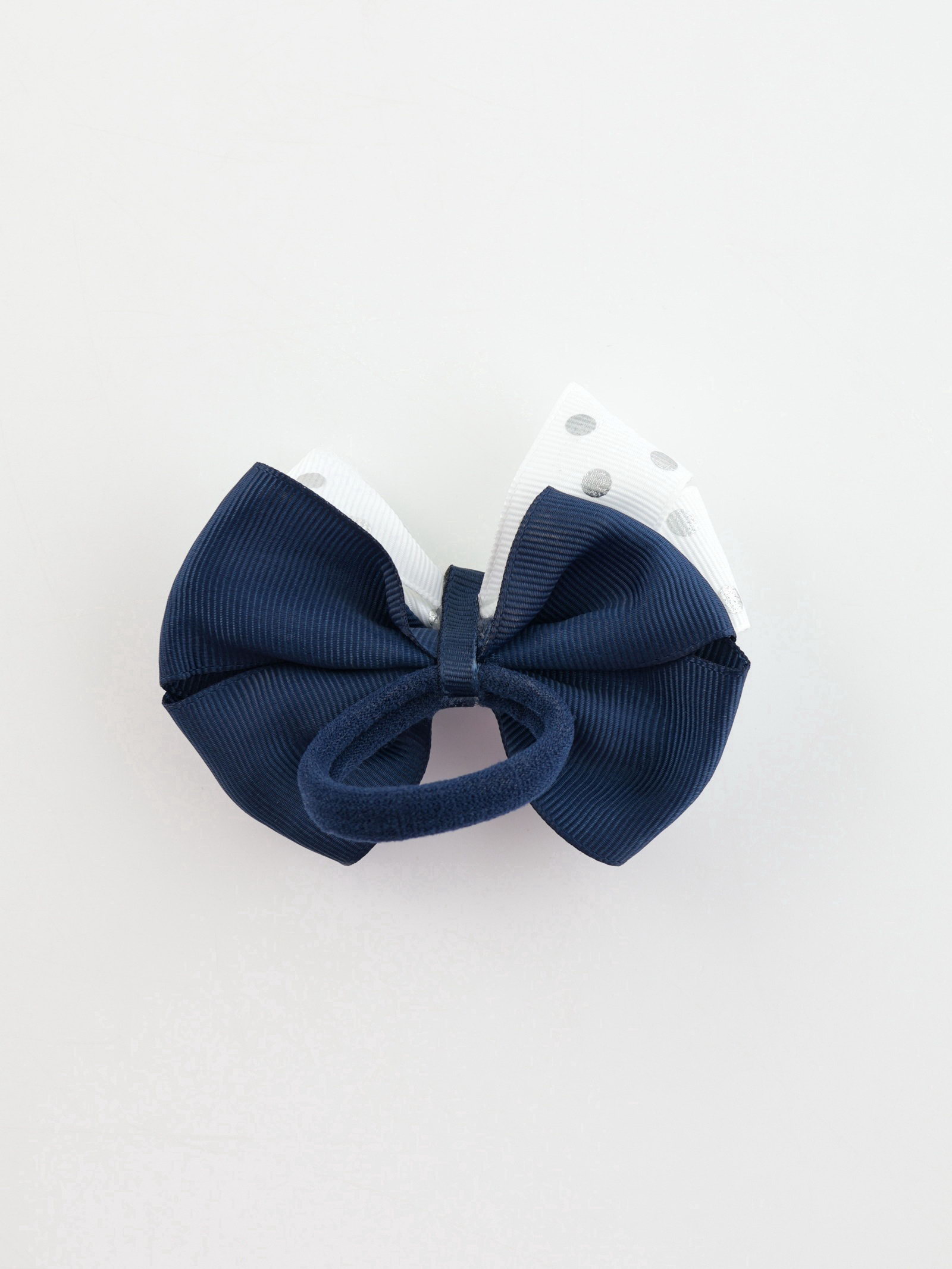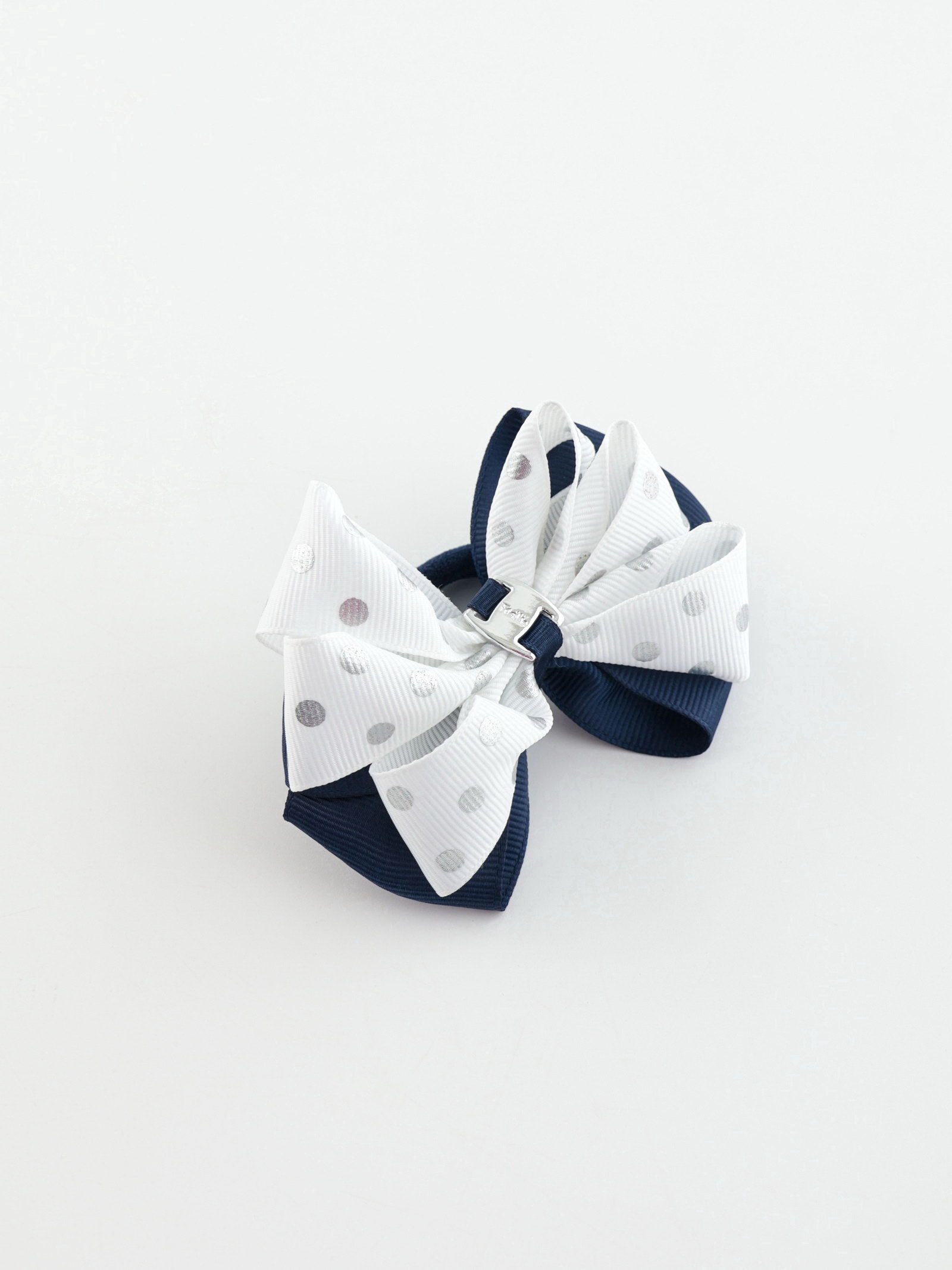 Бант для волос на резинке "Школьница", горох серебро, 8 см, бело-синий, 5 см., Китай