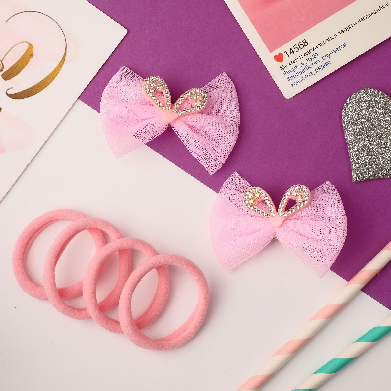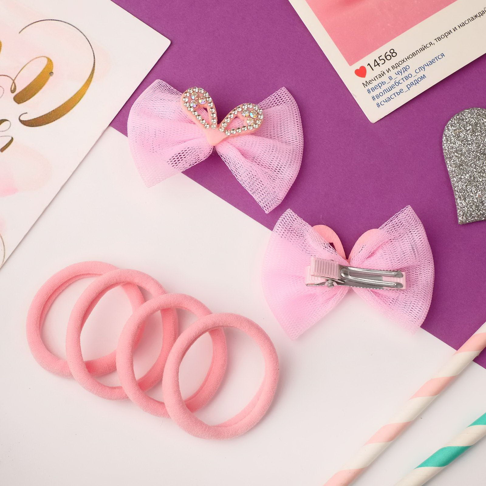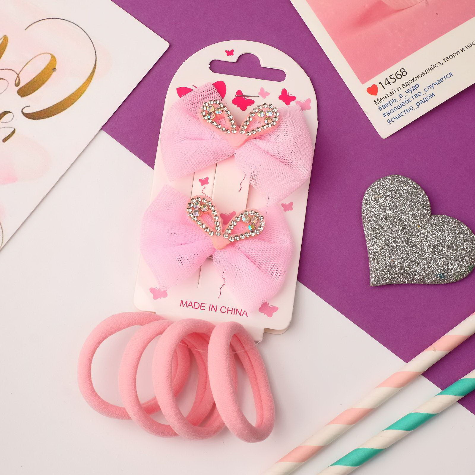 Набор для волос "Очаровашка", 2 зажима, 4 резинки, ушки перелив, розовый, Китай