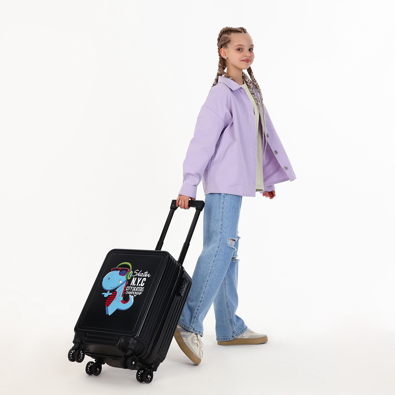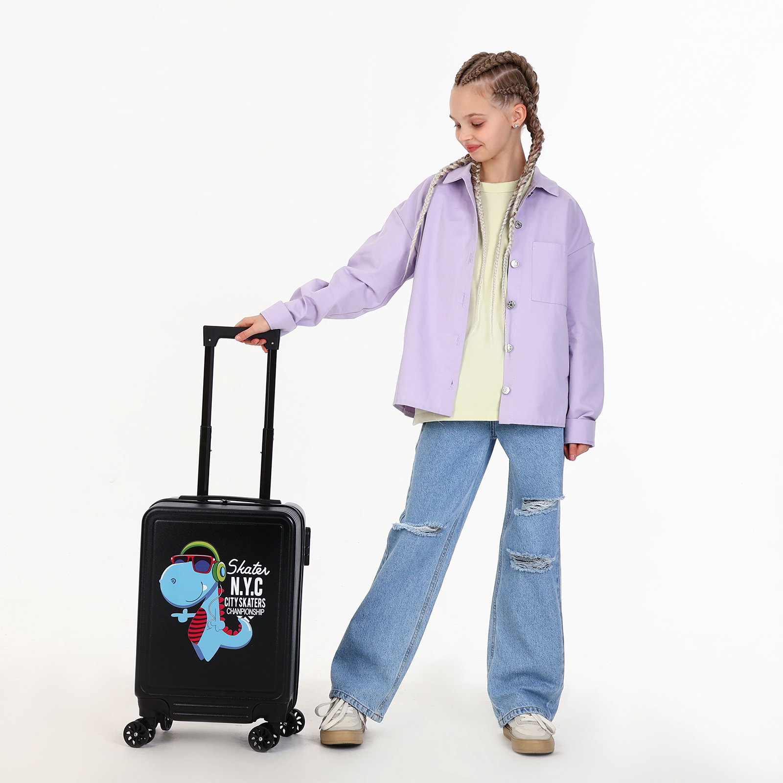 Детский чёрный чемодан на четырёх колёсах идеальный первый багаж для маленького путешественника. Компактный размер 18 дюймов удобен для ребёнка, а прочный пластиковый корпус выдерживает активное использование. Молния надёжно закрывает основное отделение. Особенности конструкции
