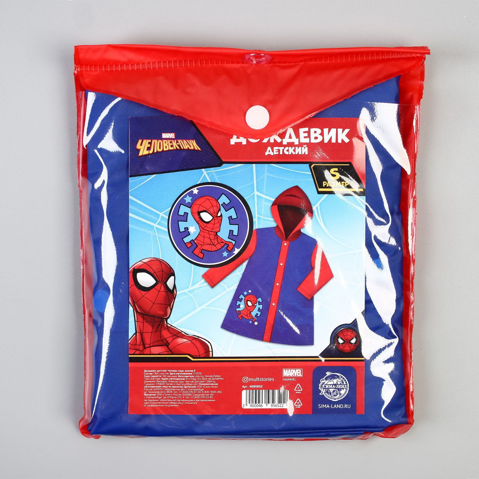 Дождевик детский, размер S, 92-98 см, Человек-Паук, 45x57x0.5 см., MARVEL, Китай