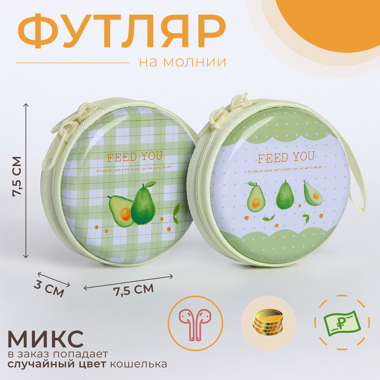 Размер упаковки: 3 x 7.5 x 7.5 см. tnved: 7326910000 Вид: Монетница Изображение: Авокадо Для кого: Для девочки Цвет: МИКС Вид застёжки: Молния