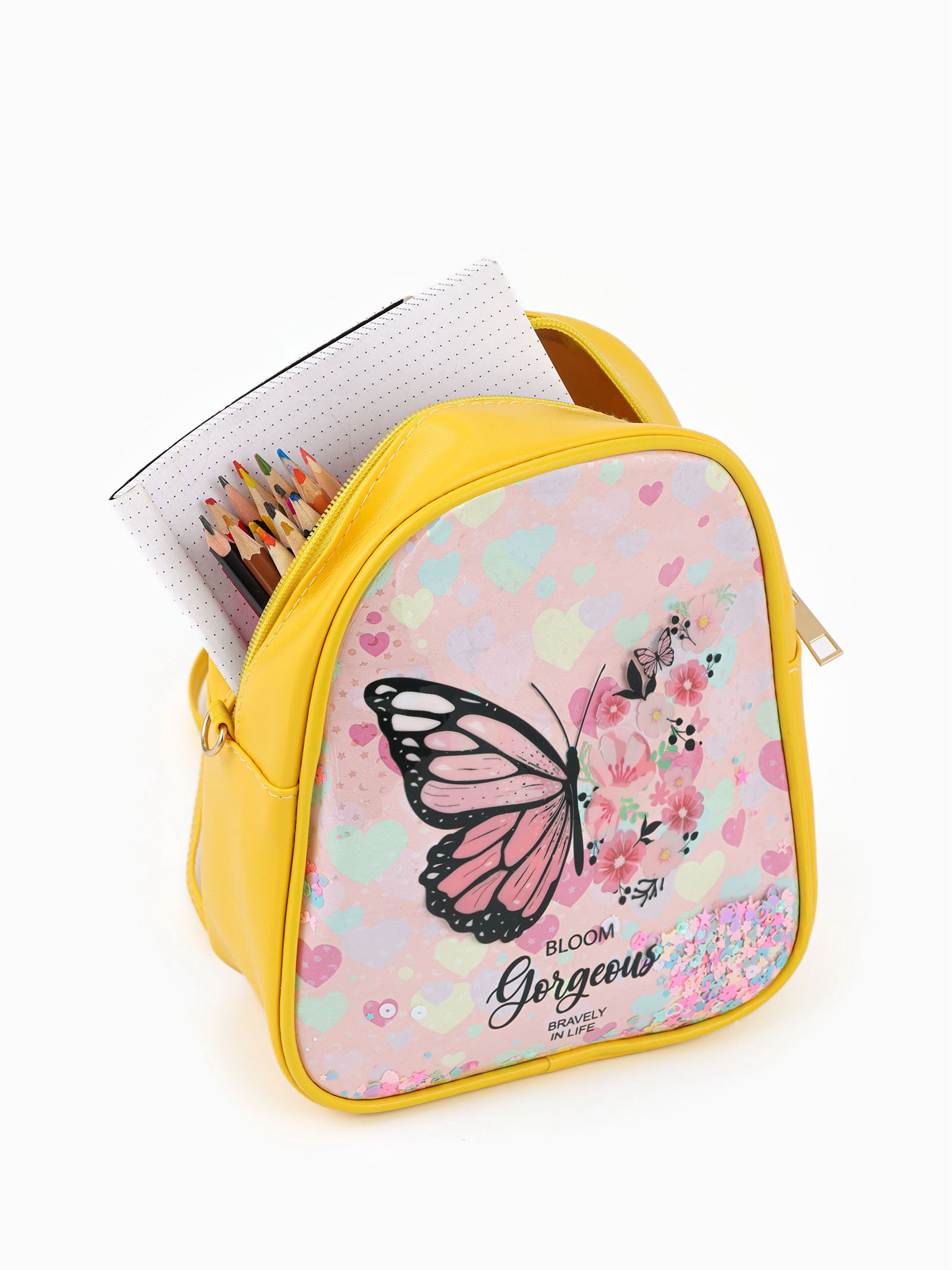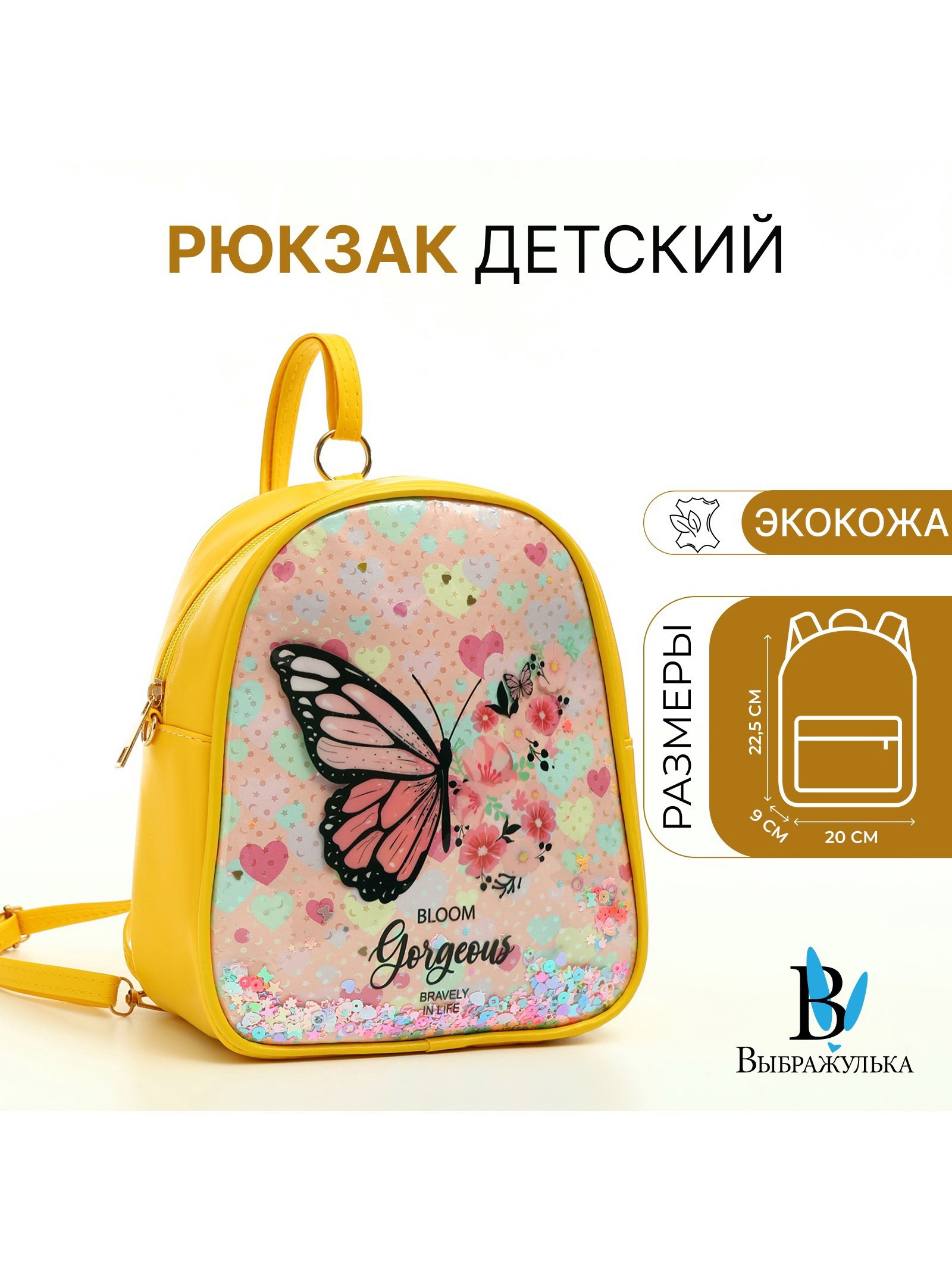 Размер упаковки: 23 x 3 x 25 см. Количество лямок: 2 Количество отделений: 1 Набор: Нет Особенности ранцев: Мягкая спинка Возраст: Дошкольный Цвет: Жёлтый Для кого: Для девочки Вид застёжки: Молния Изображение: Бабочка Размер: До 15 литров (маленький) см tnved: 4202921200 Мягкий школьный рюкзак это стильный и практичный аксессуар для учеников начальных классов. Милый дизайн делает его идеальным выбором для детей. Рюкзак сочетает в себе лёгкость, удобство и функциональность, что важно для повседневного использования. Особенности
