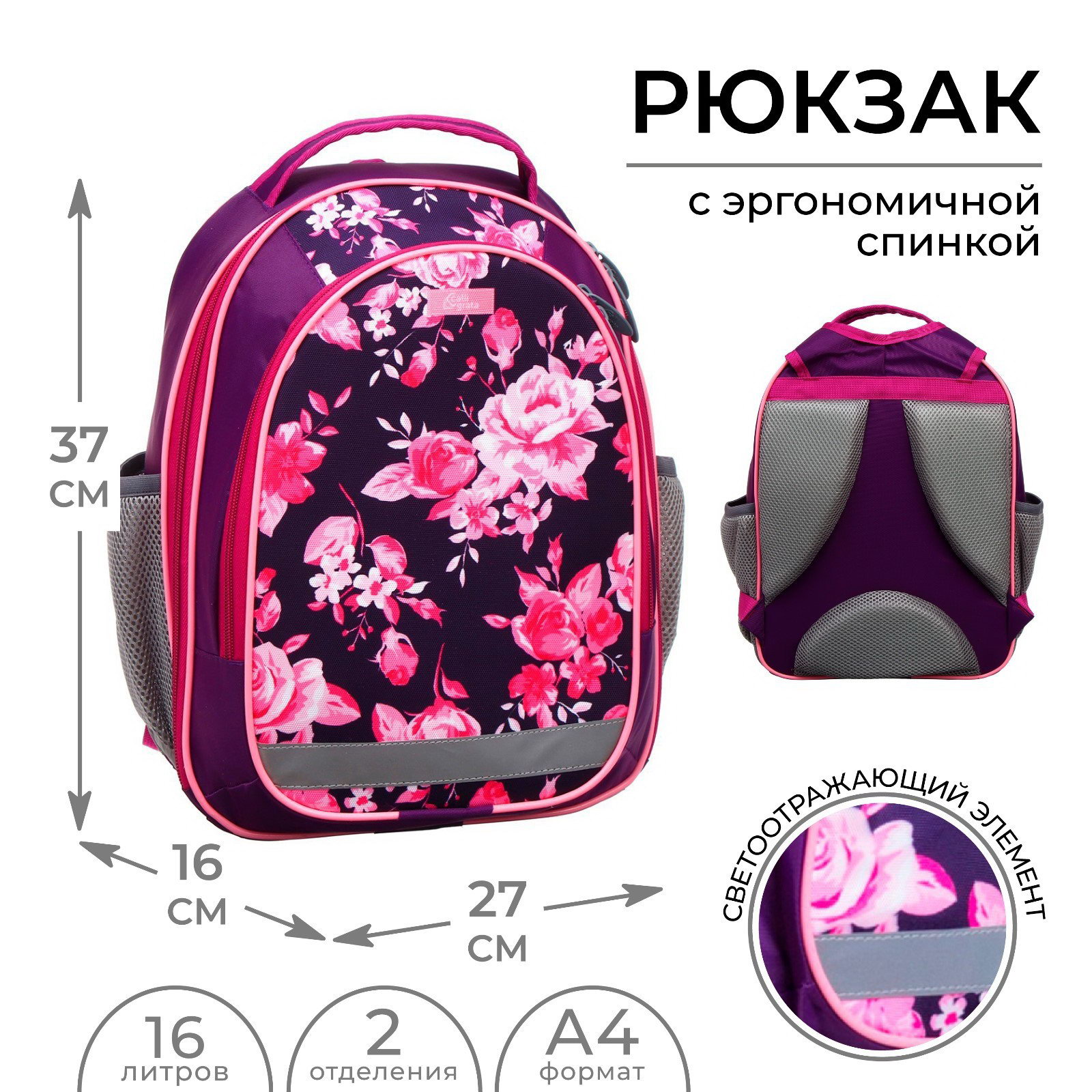 Рюкзак школьный, 37 x 27 x 16 см, эргономичная спинка, Б "Цветы", сиреневый, Calligrata, Россия