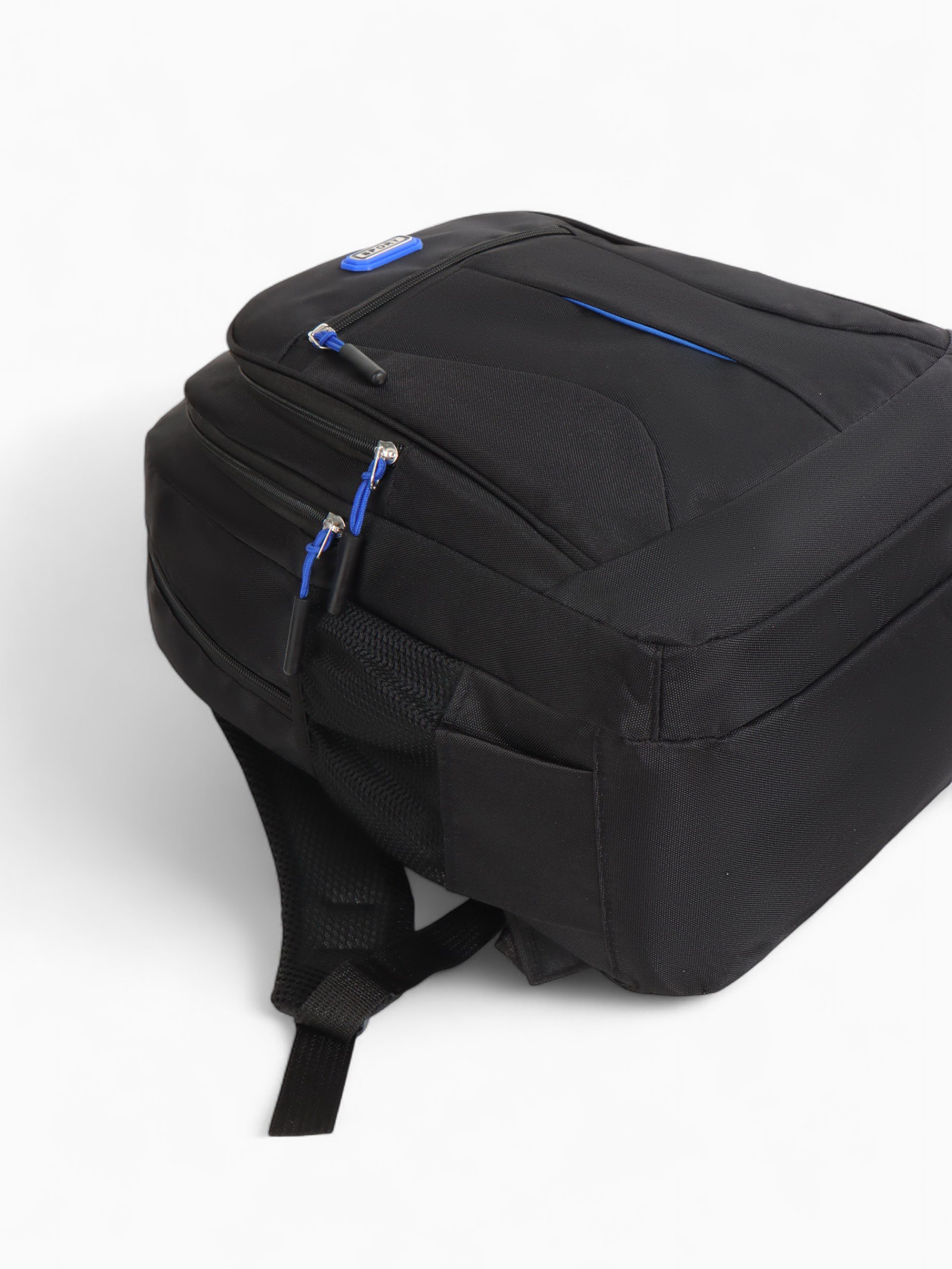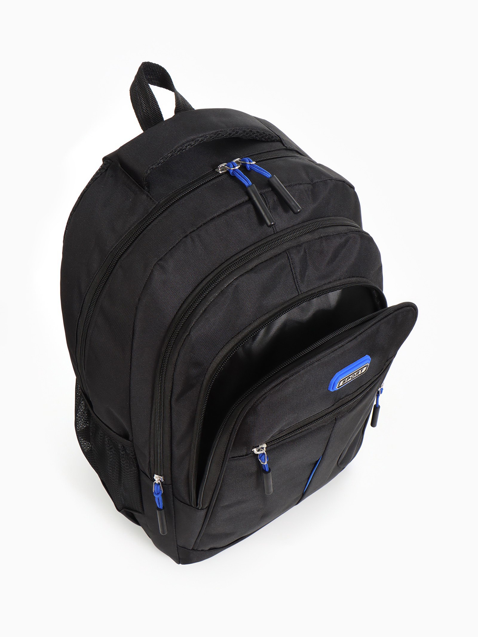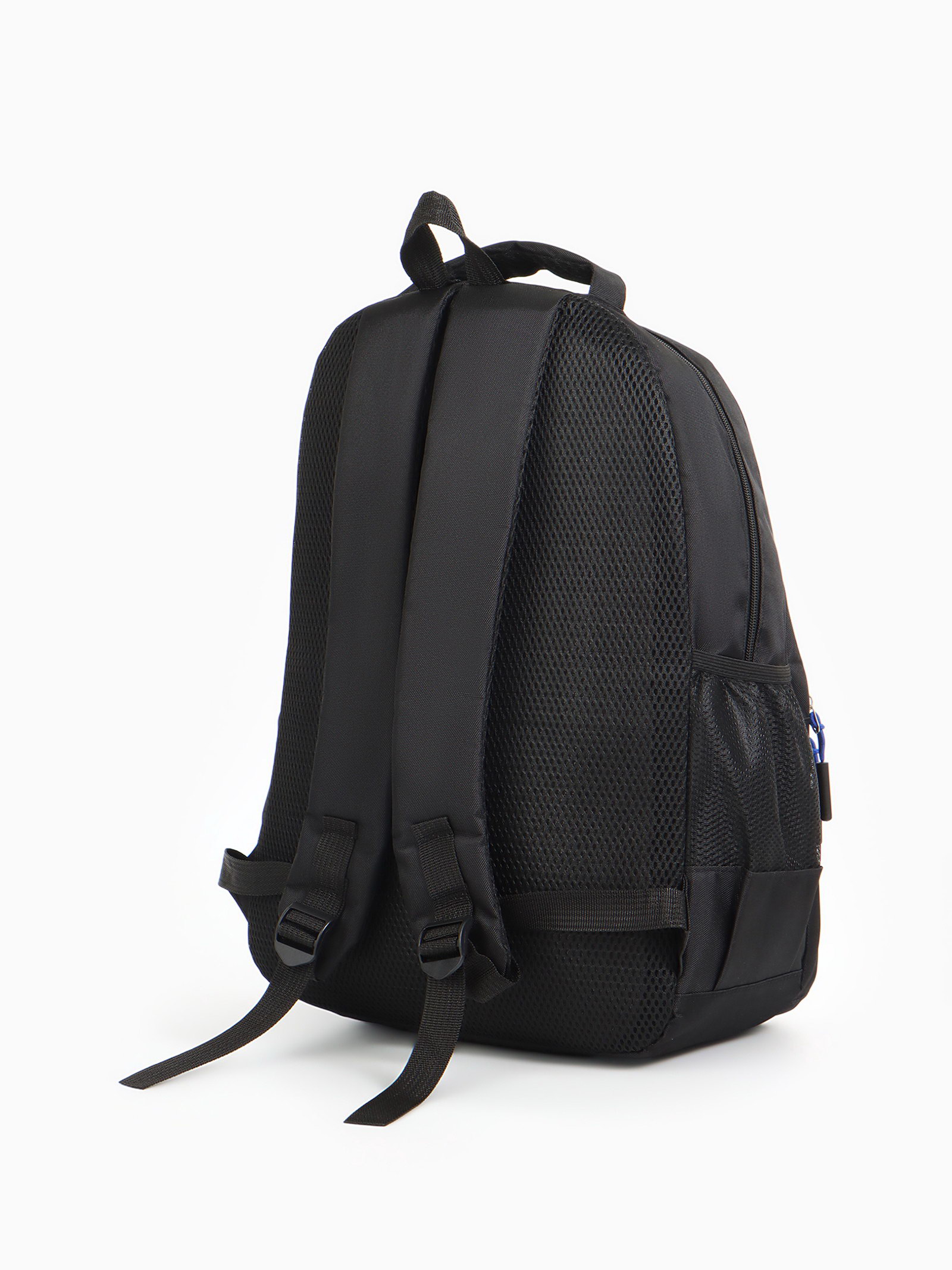 Рюкзак школьный на молнии, с карманами, чёрный/синий, 14x31x47 см., Китай